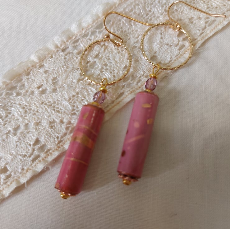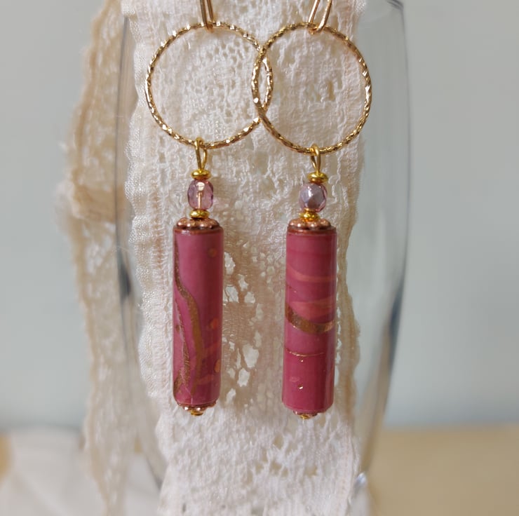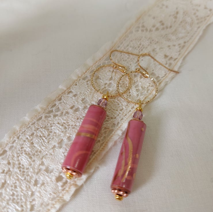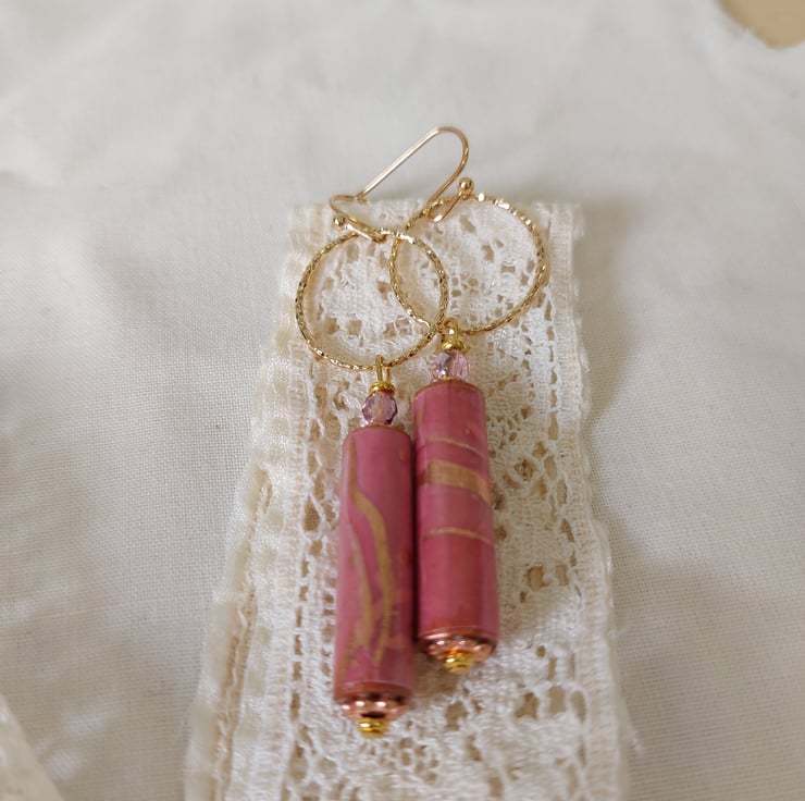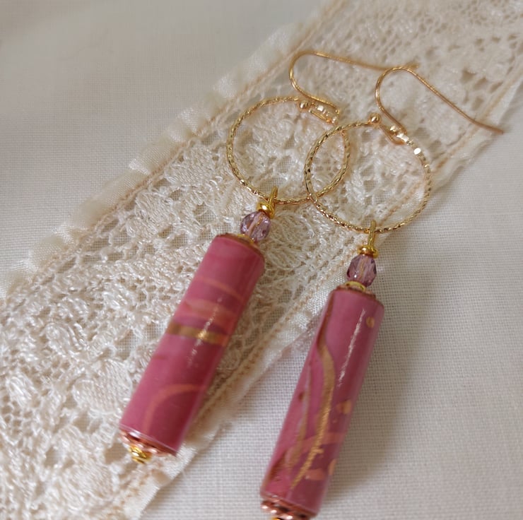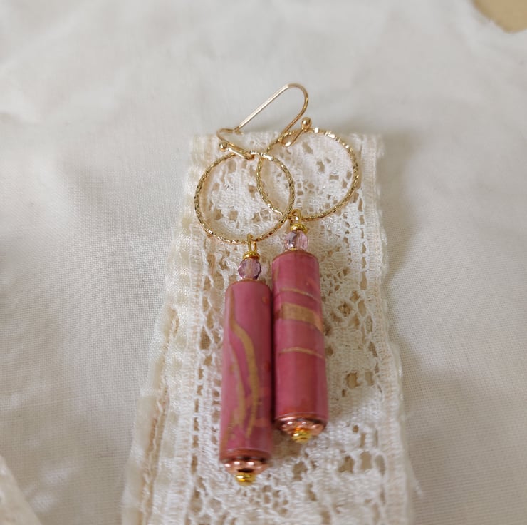Drop earrings feature hand crafted paper beads made from old book pages and painted with acrylic paints before covering with marbled pink and gold paper purchased in Japan. The beads have then been coated with several coats of varnish to seal them.