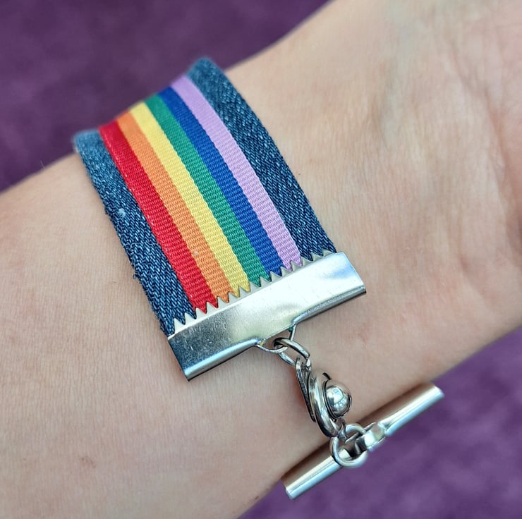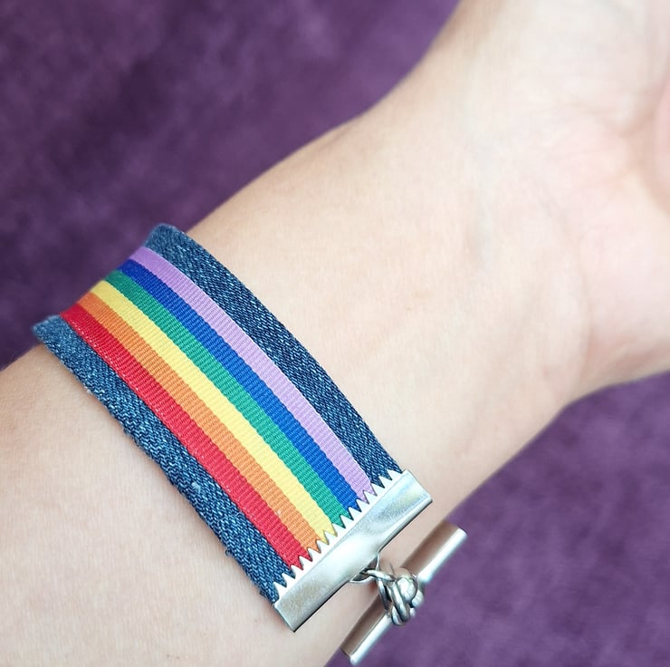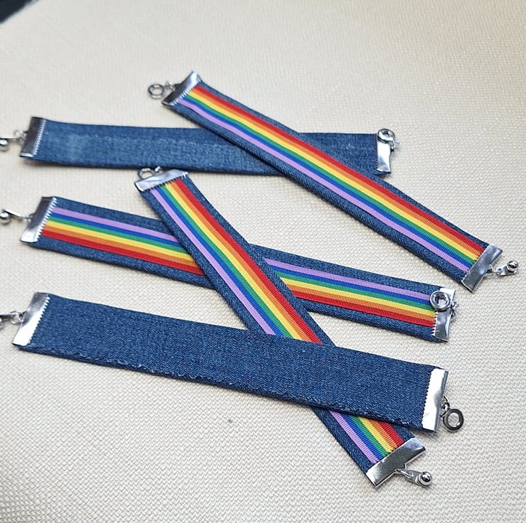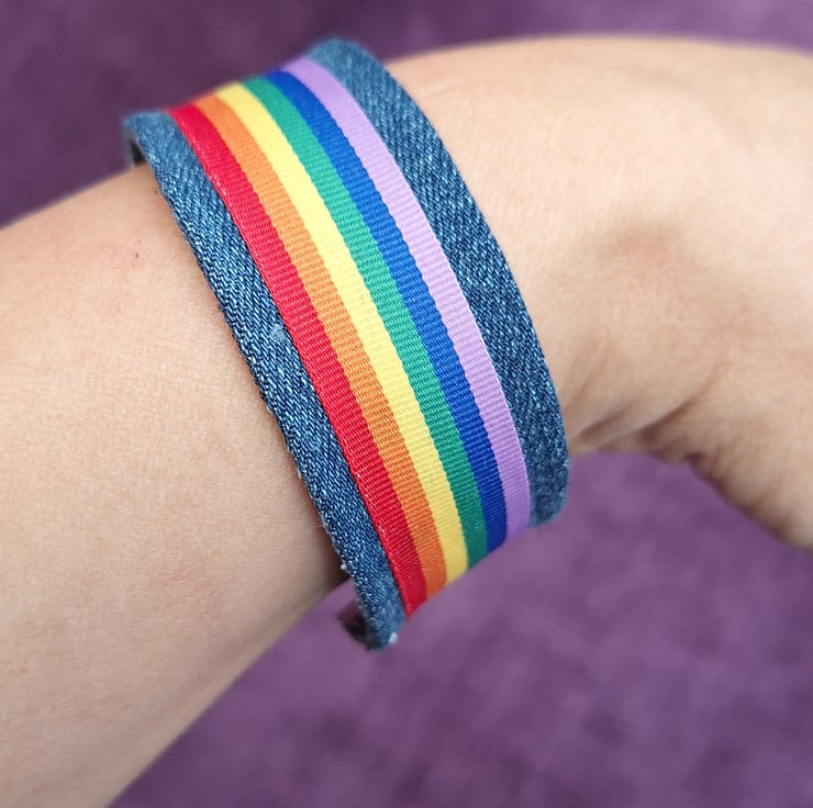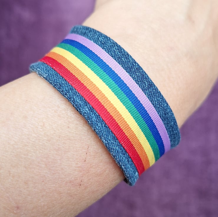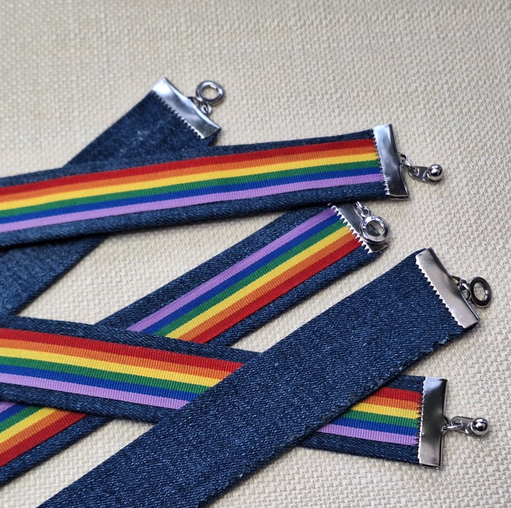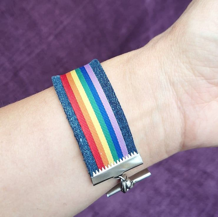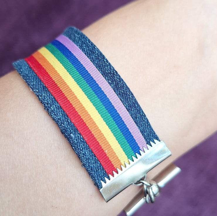 Give your wrist a splash of colour with this handmade rainbow pride bracelet, crafted from upcycled denim and finished with a vibrant rainbow ribbon that celebrates LGBTQ plus identity, love, and inclusion. Each bracelet has been handmade with care and character, giving pre-loved jeans a new lease of life as a wearable statement of pride. It's unique and embraces perfect imperfections.
