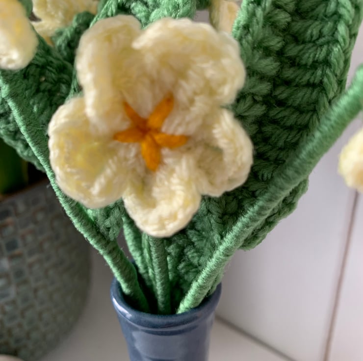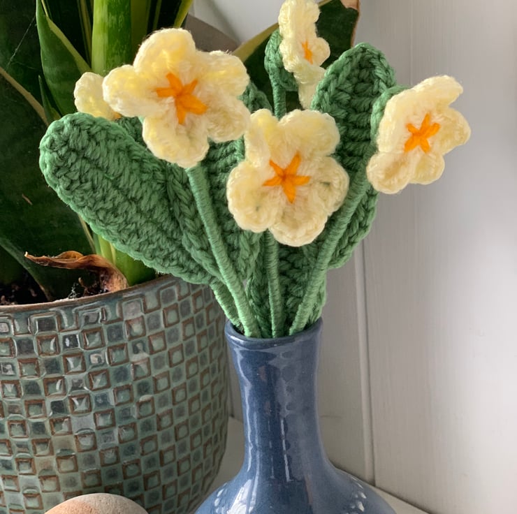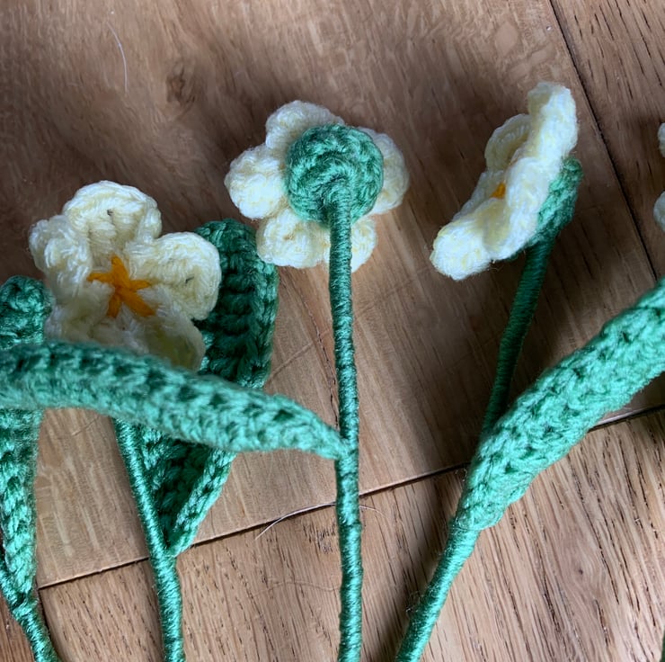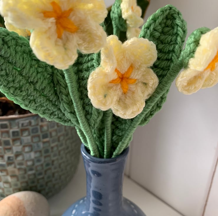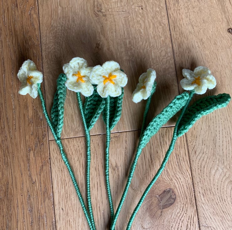 Each primrose is handmade with acrylic yarn and mounted on a stem of garden wire wrapped in yarn and finished with florist tape.