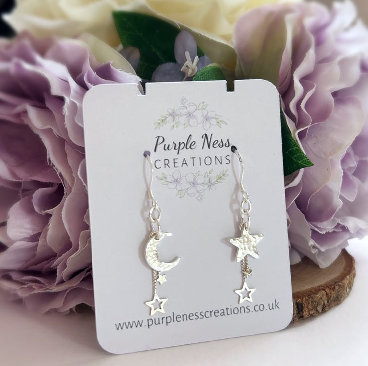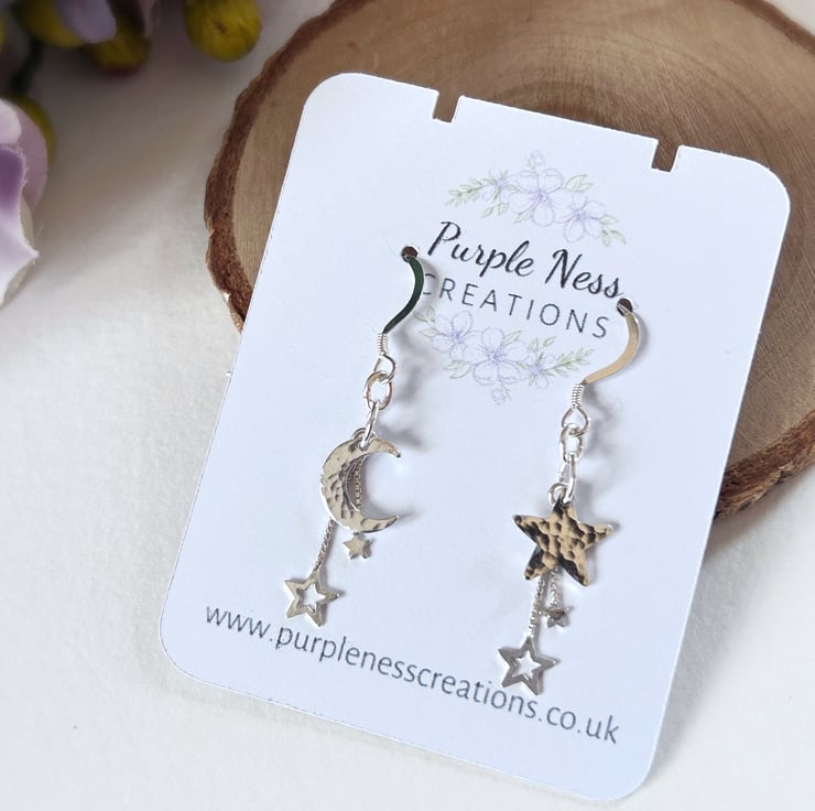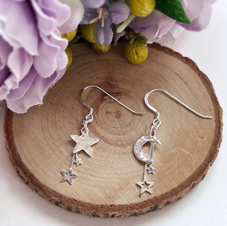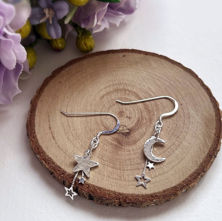Featuring a 10mm sterling silver star and a 10mm sterling silver crescent moon, both hammered and textured by hand to create a twinkly, dappled effect. These are then attached to sterling silver ear wires with an added duo of dainty sterling silver stars dangling behind the main shape.
