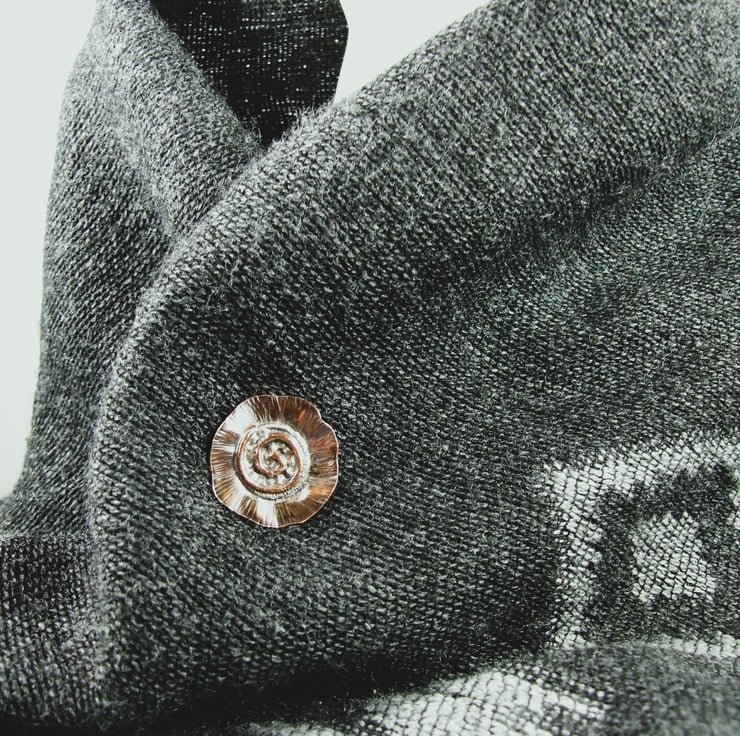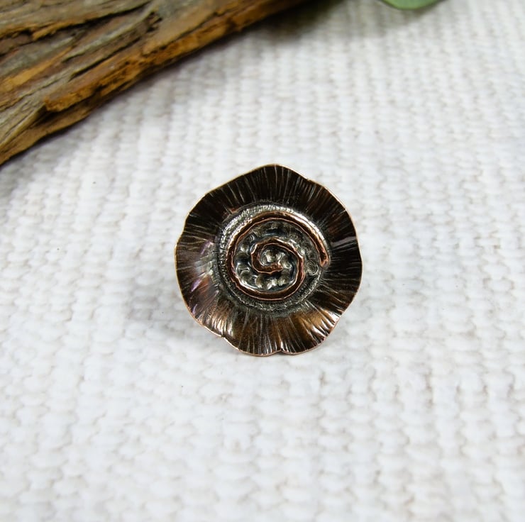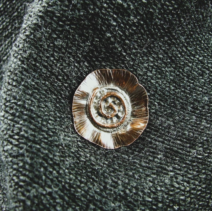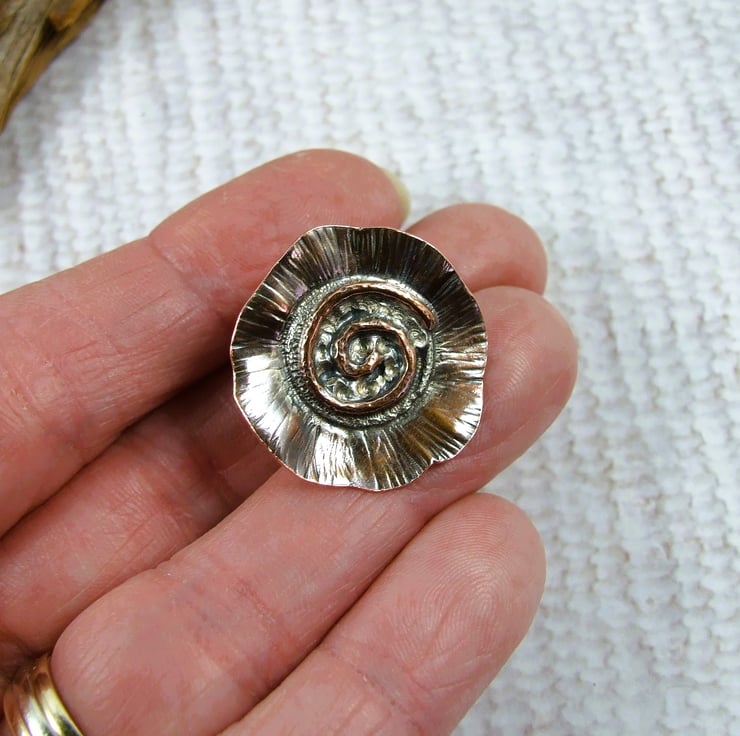 I created this lovely flower using copper sheet for the base which cut out then hammered for texture. The centre is made up of an outset silver ring with a copper spiral and lots of small copper and silver beads all soldered in place. Soldered to a sterling silver pin and push click back.