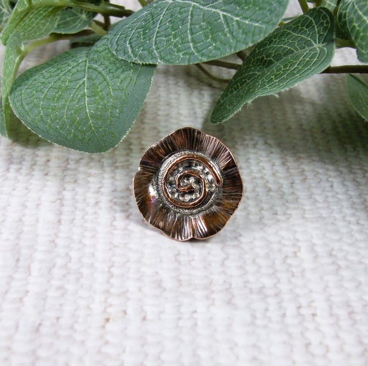 Flower Pin Brooch, handcrafted flower in copper and sterling silver. Could also be worn as a lighter shawl pin.