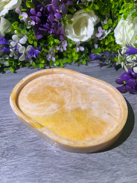 A handmade oval tray in gold and beige. Approximately 15.5cm x 11cm x 1.8cm in size, perfect for jewellery, keys, chocolates, soap, you name it! Each piece is unique and comes gift-wrapped, perfect for gifting or treating yourself.