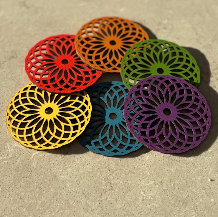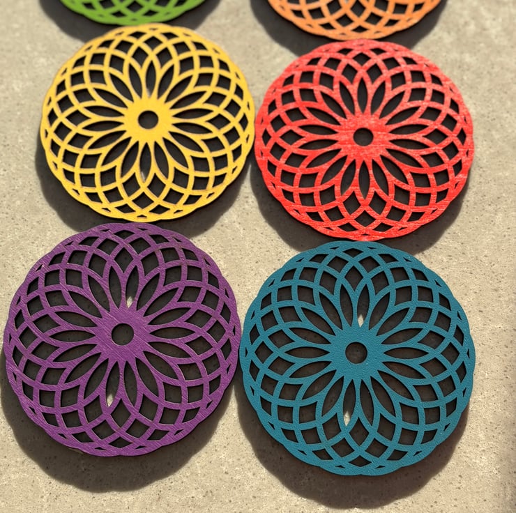 These vibrant, laser-cut wooden coasters are designed to bring colour and character to your table. Each coaster features an intricate geometric floral pattern, carefully cut to create a striking balance of detail and symmetry. Finished in rich, eye-catching colours, they look just as beautiful on display as they do in use.