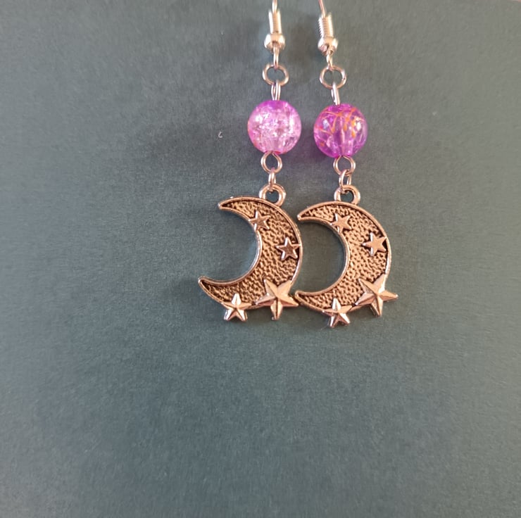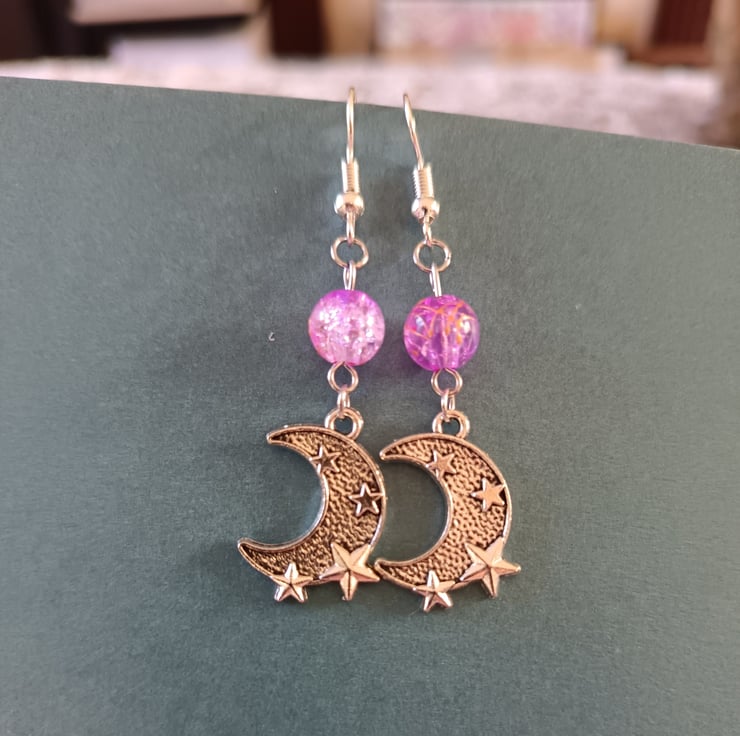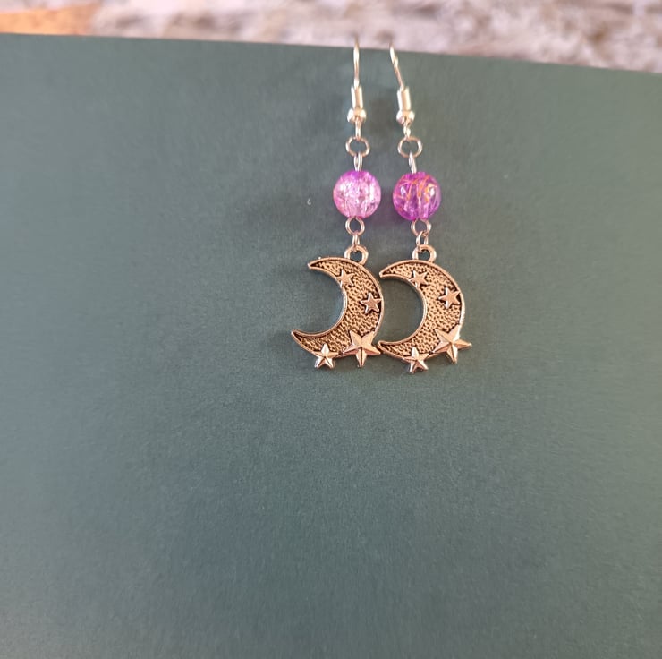 These handmade earrings are crafted with stainless steel hooks, stainless steel silver crescent moon charms with star details, and lilac glass crackle beads. With their celestial boho vibes, these make a unique and versatile accessory or an ideal gift for moon lovers.