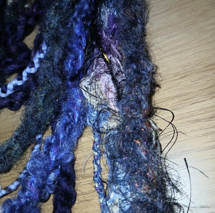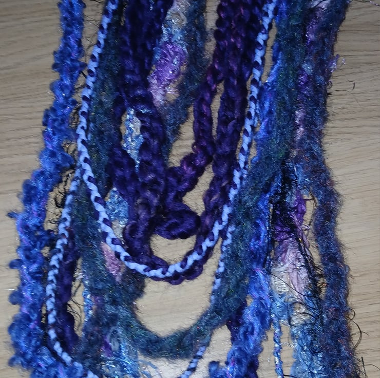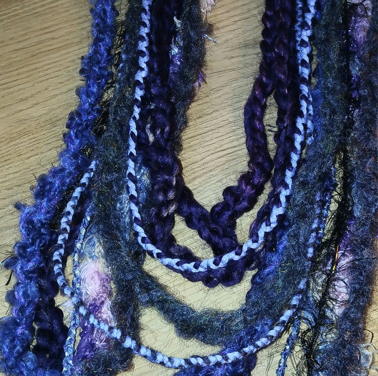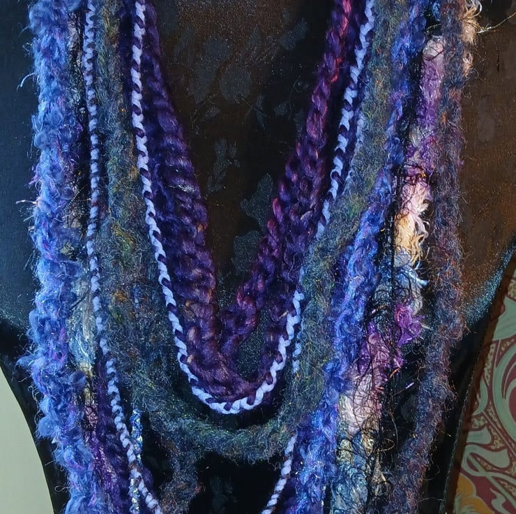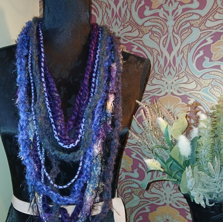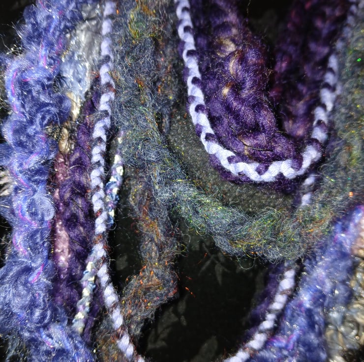 A beautiful, original design, handmade infinity scarf. This one is named Alchemy, and it is a mixture of stunning purple and blue yarn that has been crocheted and plaited, creating a uique, alternative fashion accessory. What makes it even more special, it has been made almost exclusively, using recycled, unwanted, unloved, and repurposed materials.