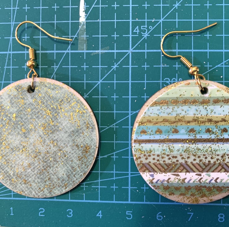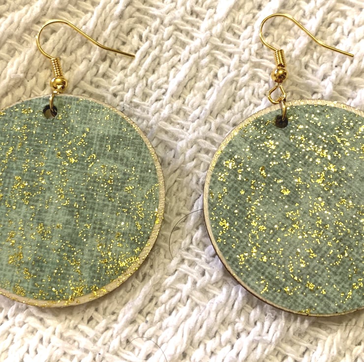 1 pair of mixed media plywood disc earrings made with paper, glitter and gold coloured metal earring hooks.