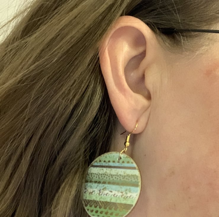 Hand crafted in the UK in a smoke and pet free environment, these earrings are a blend of natural textiles and modern patterns. Made with sustainable sourced plywood discs and upcycled paper from various sources, a splash of glitter to catch the light. Finished with an outdoor grade sealant but please don't get them wet. There's a different design on both sides, one is striped in shades of green, gold and white, the other is plain green with a glitter finish.