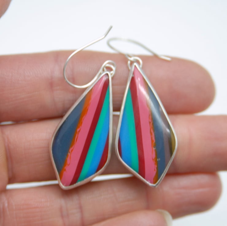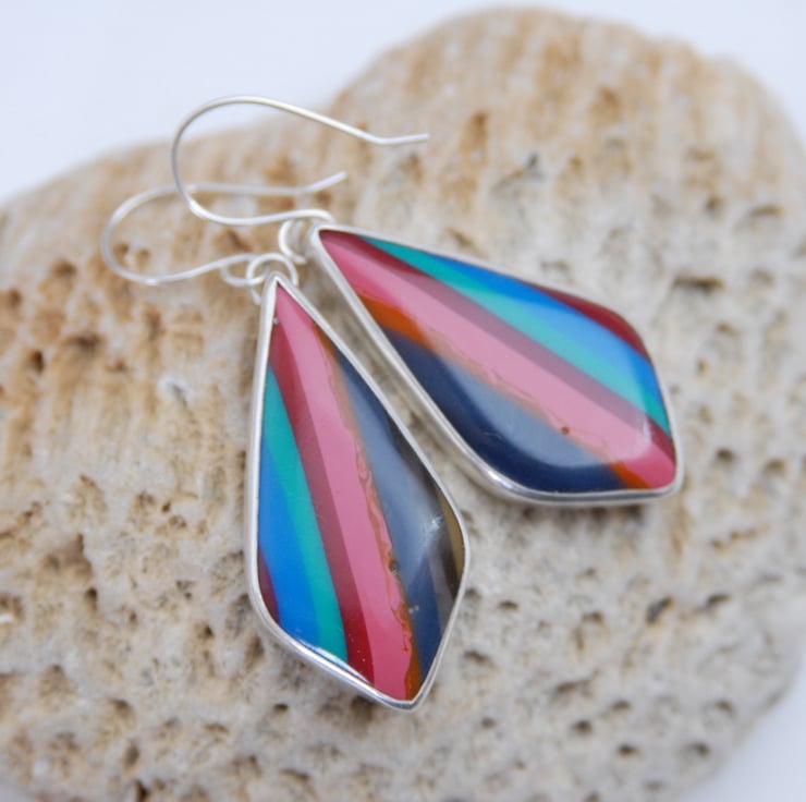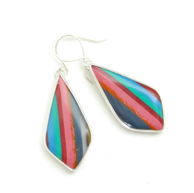 These colourful drop earrings feature striped cabochons of vibrant surfite which have been smoothly bezel set in sterling silver and then finished with simple silver hooks. The kite shaped surfite cabochons have vertical stripes of blue, green, red and pink, the central pink stripe makes a real statement. These earrings make a real statement and measure 55mm (from top of the hook to the bottom) by 20mm wide, yet surfite is lightweight so they are not heavy in the ears. Comes in a gift box.