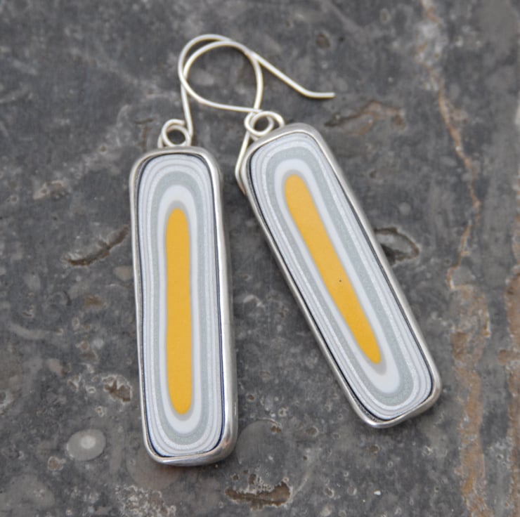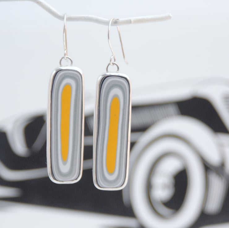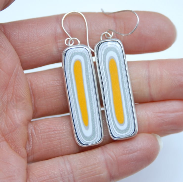 These striking earrings feature rounded oblongs of fordite which has been bezel set in sterling silver and then finished with simple silver hooks. The fordite has wobbly rings in sparkly colours including silver, pewter and white with an egg yolk yellow streak in the middle. The patterns almost match. The earrings measure approx 59mm from the top of the hook to the bottom by 13mm across, fordite is much lighter than stones so even those these earrings are large they are lightweight and comfortable to wear. Comes gift boxed.