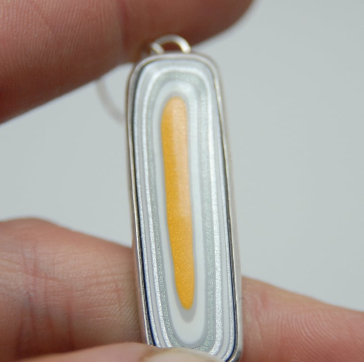 Fordite is the name given to many layers of cured car paint that builds up in old style spray booths at car factories. The paint gets baked hard in between each layer leading to a durable material that can be cut to show off the many colours. This particular material I bought from a guy who worked at Ford's Wayne Assembly plant and he had collected it from the production line in circa 2015 (the sparkly yellow is called 'Tangerine Scream' and was unique to Focus models at the time). I cut this material myself so if you love fordite but want something else making drop me a message, I have quite a stash of rough from various eras and manufacturers. Fordite is becoming increasingly hard to source and thanks to more efficient painting processes less is being made so if you love your cars get some of the unique material whilst you can.