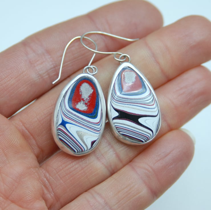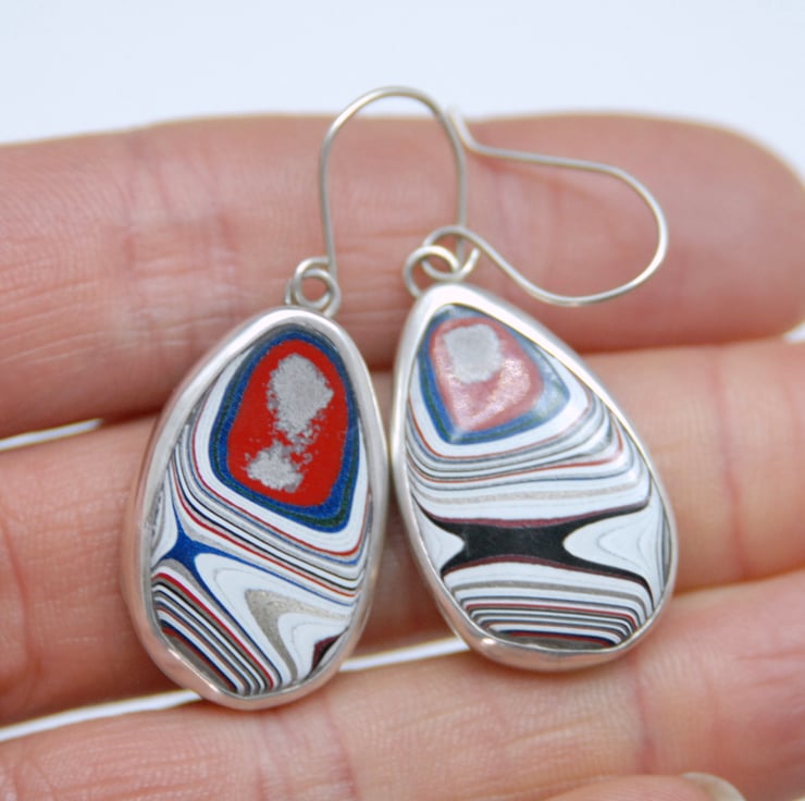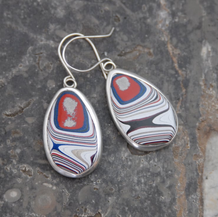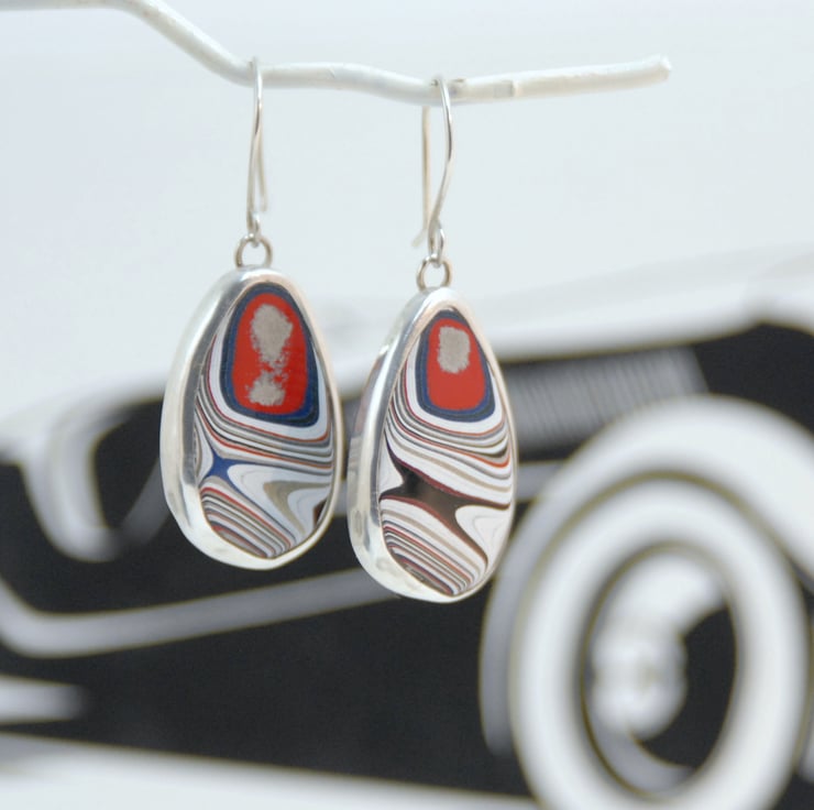 These drop earrings feature fordite which has been bezel set in sterling silver then finished off with simple sterling silver hooks. The patterns on the earrings don't match but both have a colour palette featuring sparkly silver, white, red, and bright blue. The fordite measures a sizeable 45mm (from the top of the hook to the bottom of the setting) by 18mm across. Comes gift boxed.