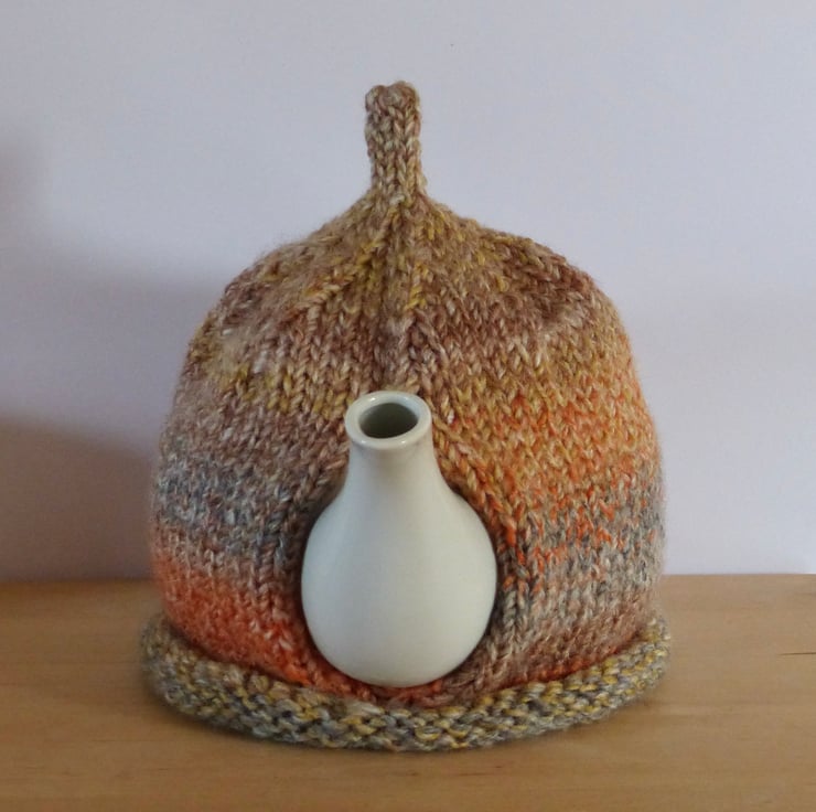 A hand knitted Tea Cosy in a chunky variegated yarn in shades of Brown, Grey, Orange and Beige. It has a 'pixie' top and three natural wood buttons on the front for decoration.