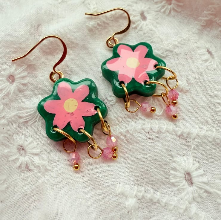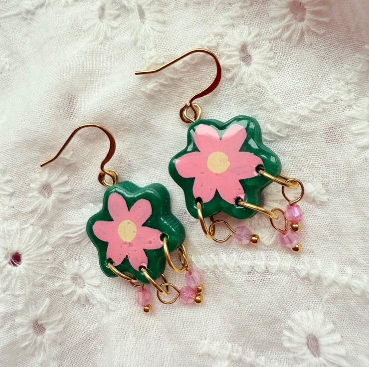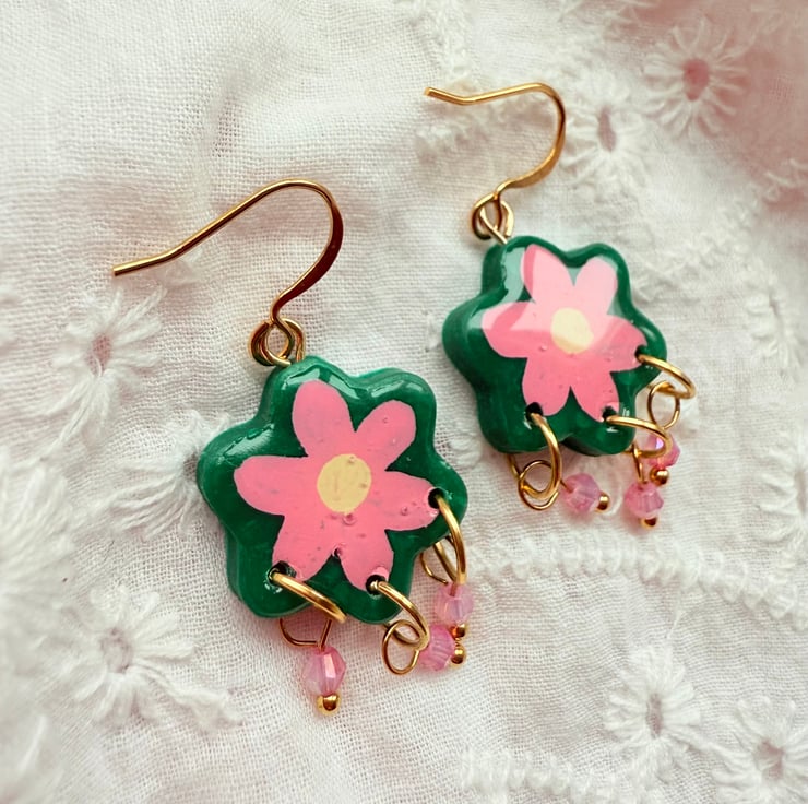 - Cute flower shaped Emerald Green polymer clay earrings with hand painted Pink flowers.