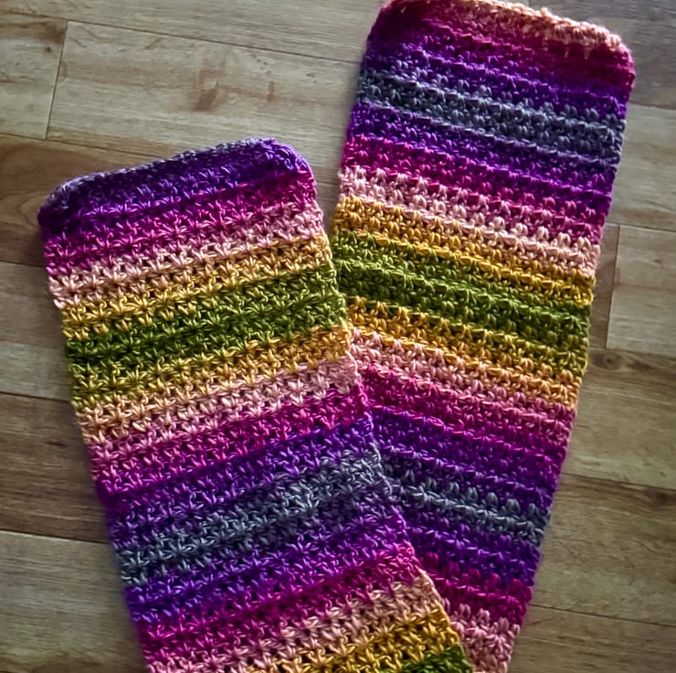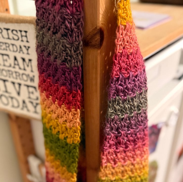 A wonderfully bright multicoloured crochet scarf, consists of pretty purples, reds, oranges, yellows and vibrant green. Lovely texture and softness, will make it a pleasure to wear.