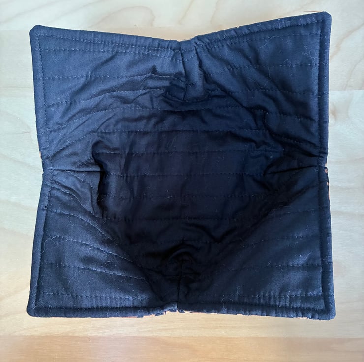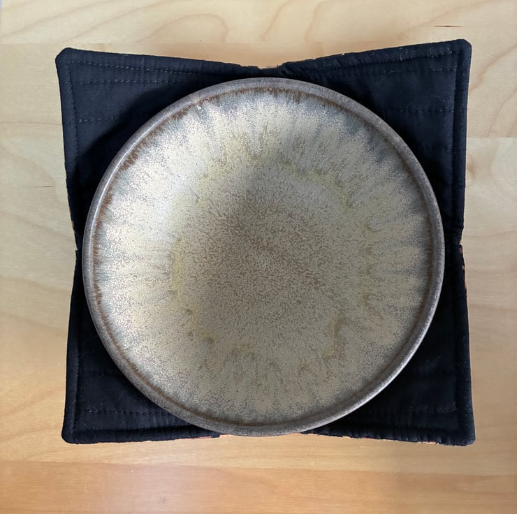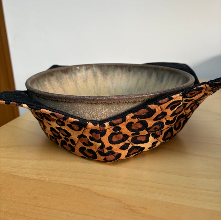 The reversible bowl cosy is made with this lovely leopard print fabric with plain black fabric on the reverse. Both sides are quilted with black thread.