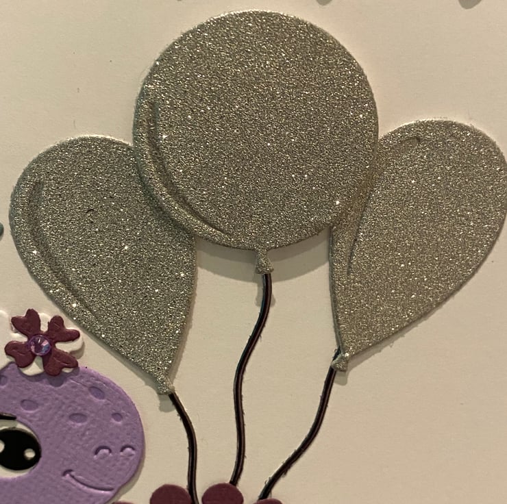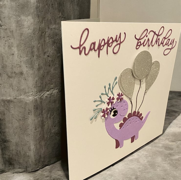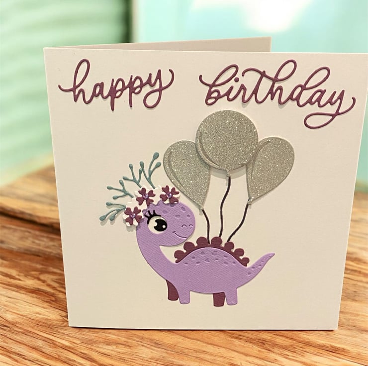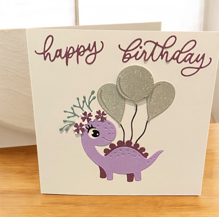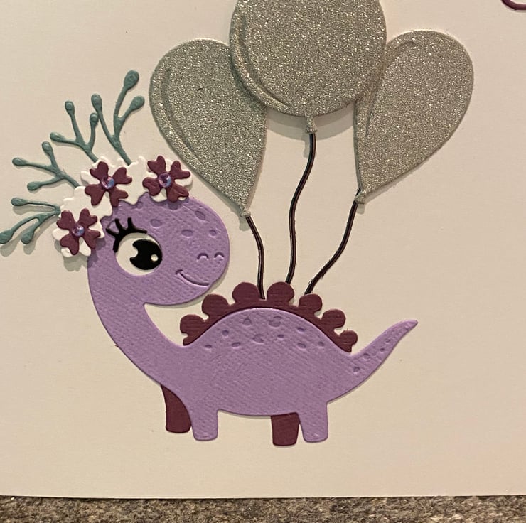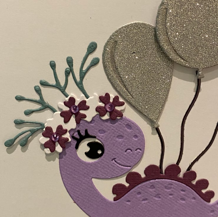 Celebrate a special birthday with this whimsical handmade card. Featuring a cheerful purple dinosaur, adorned with glittery silver balloons and a floral crown of delicate foliage and flowers this friendly creature brings joy and sparkle to any celebration. The soft pastel palette make it perfect for children, dino-lovers, or anyone who enjoys a touch of imaginative charm.