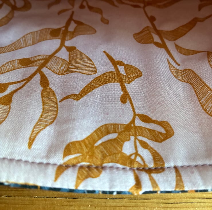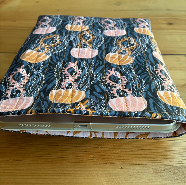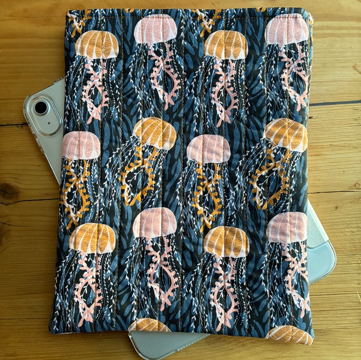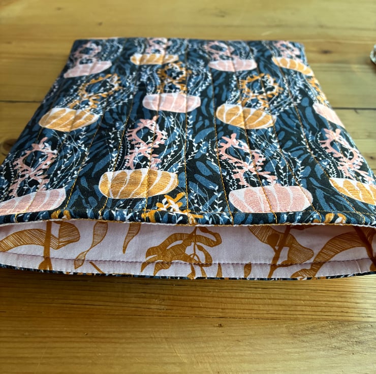 The sleeve is made in this gorgeous jellyfish print. The sleeve is quilted with mustard colour stitching and is fully lined in a mustard colour seaweed print on a pale pink background.