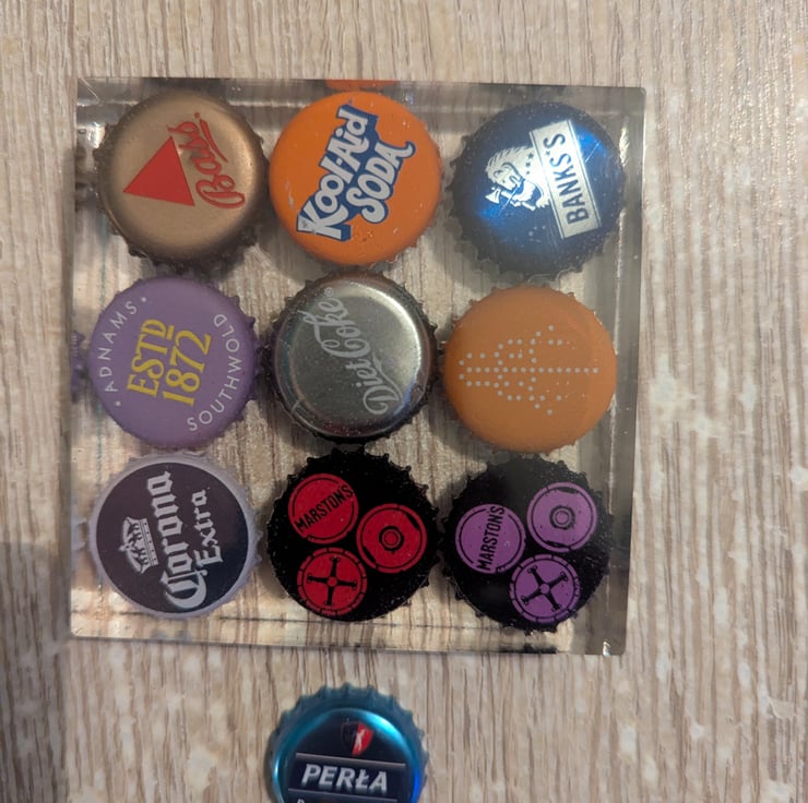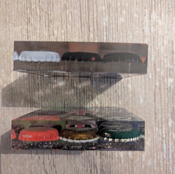 A pair of clear resin coasters with beer bottle caps set in the middle of them ,in addition two beer cap fridge magnets beer lover