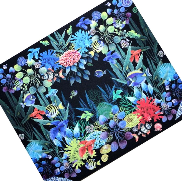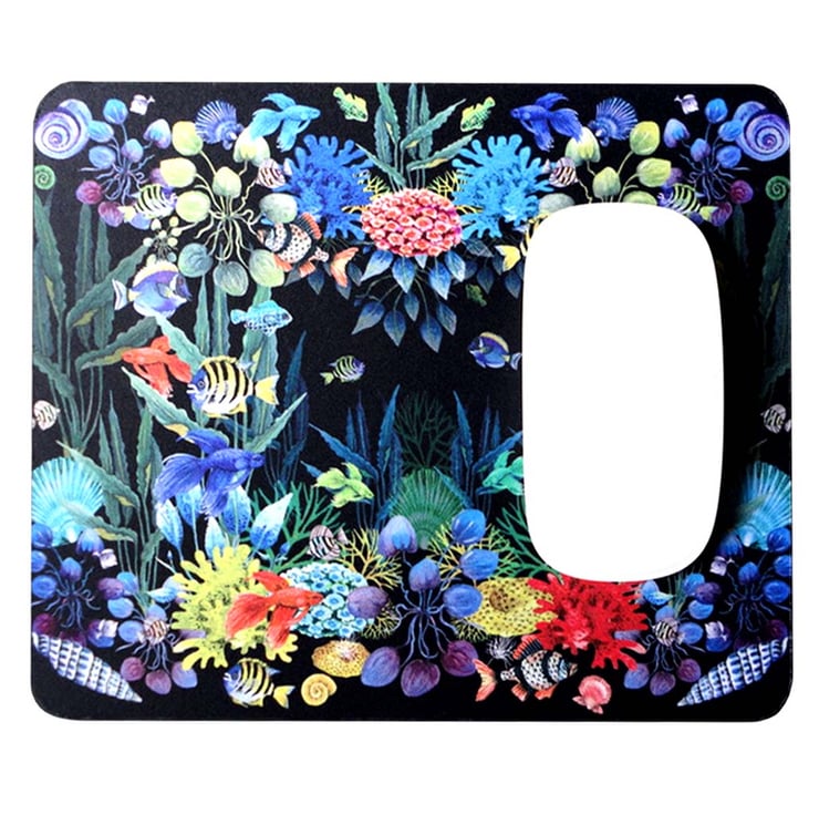 You won’t want to put your mouse down on this fabulous Coral Reef Mouse Mat! It will take you into a different world of tropical waters. The design has been adapted from one of the designs from the Melange on Black Collections of cards. The card design has been transformed from a decorative frame to an all over print. These stunning colours on black, with exotic fish, shells and living plants are all hand -painted, and will certainly brighten up your work desk or home office.