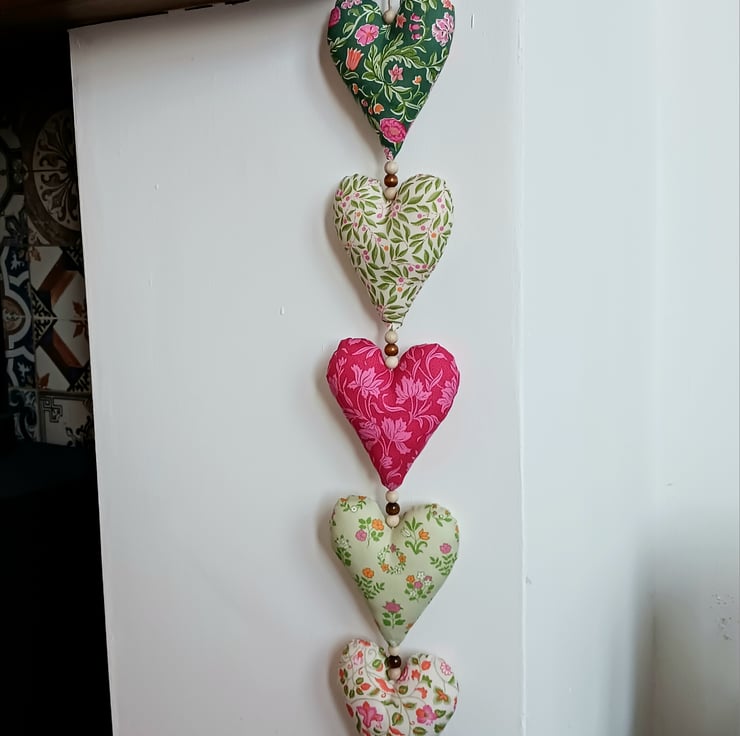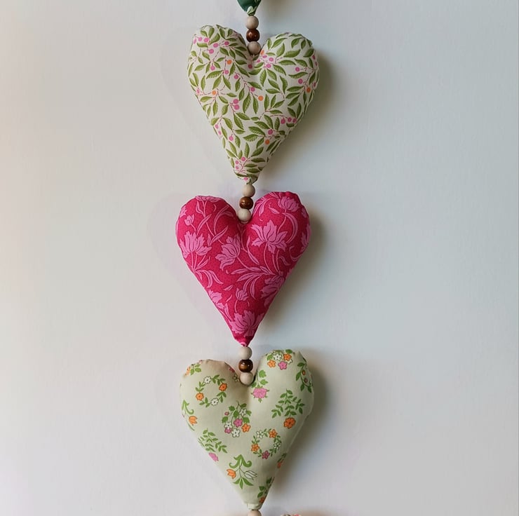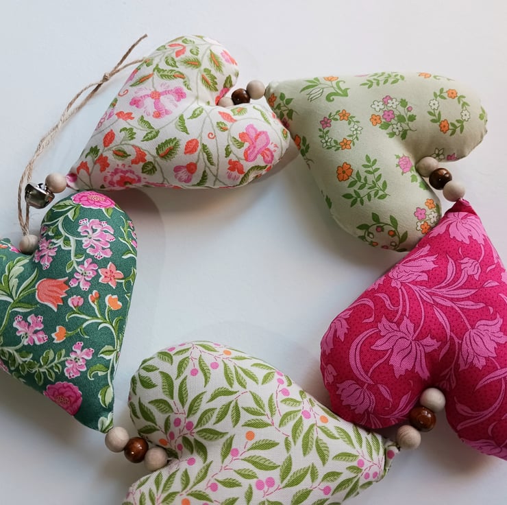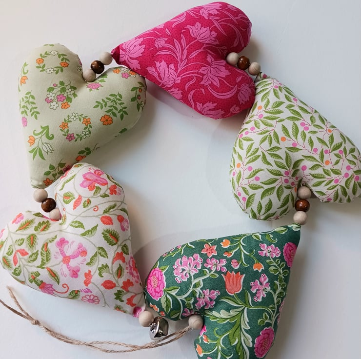 5 padded hearts in beautiful Liberty of London cotton fabrics. Perfect spring or summer decor!