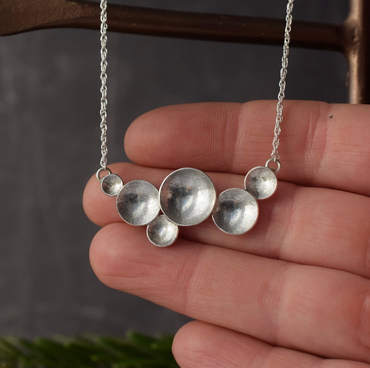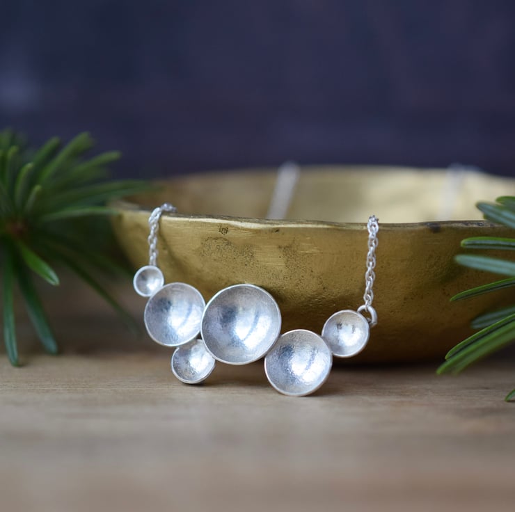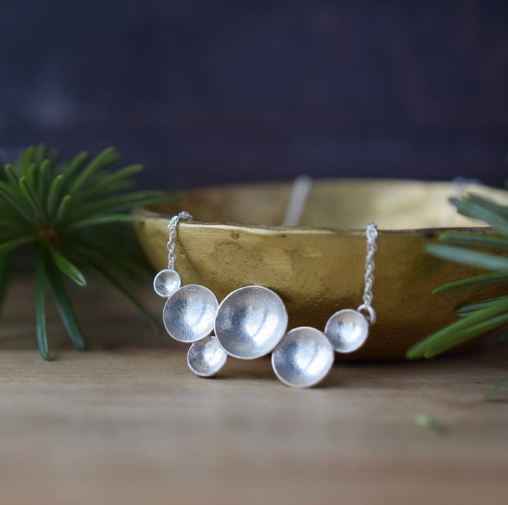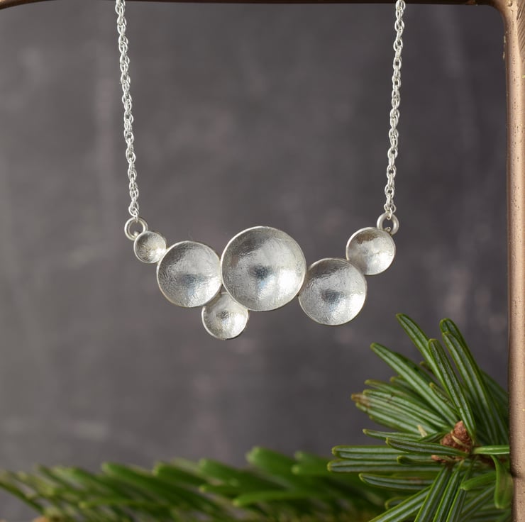 This contemporary sterling silver necklace features a cluster of textured circles or varying size, each one hammered to give a beautifully rustic finish and polished to a high shine. It's minimalist style makes it so versatile for everyday wear, making it a perfect gift for lovers of artisan jewellery.