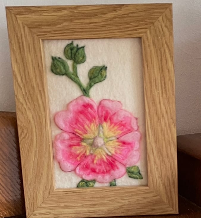 A hand felted Hollyhock artwork crafted from merino fleece. This unique textile piece captures the delicate features and colours seen in the British summer garden, using the needle felting technique. The flower is ‘painted’ with wool, felted into a natural base with added details to bring out the flowers characteristics. Every piece is completely handmade and unique, making it a beautiful original gift for nature lovers, gardeners or anyone who loves the soft texture and warmth of textile art.