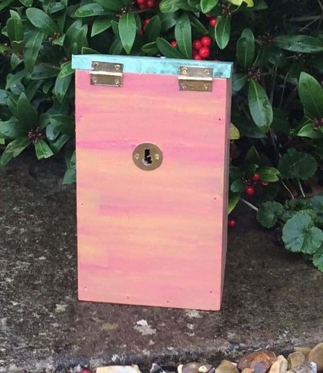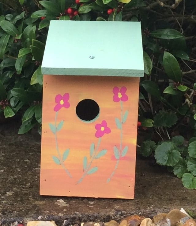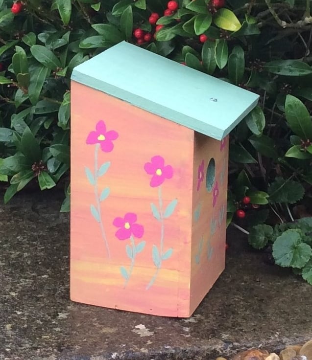 This pretty pink flowered bird house has been hand painted with special outdoor paint, and finished in several coats of outdoor varnish.