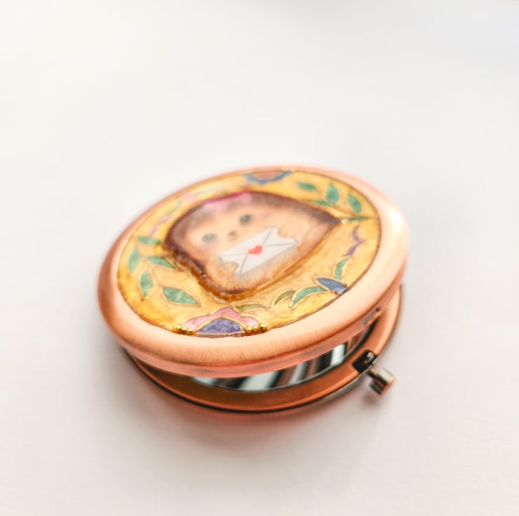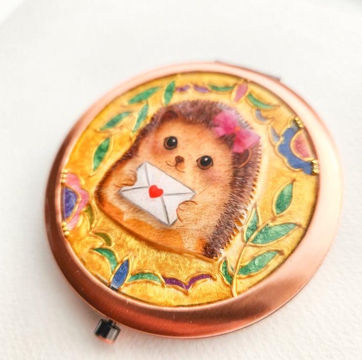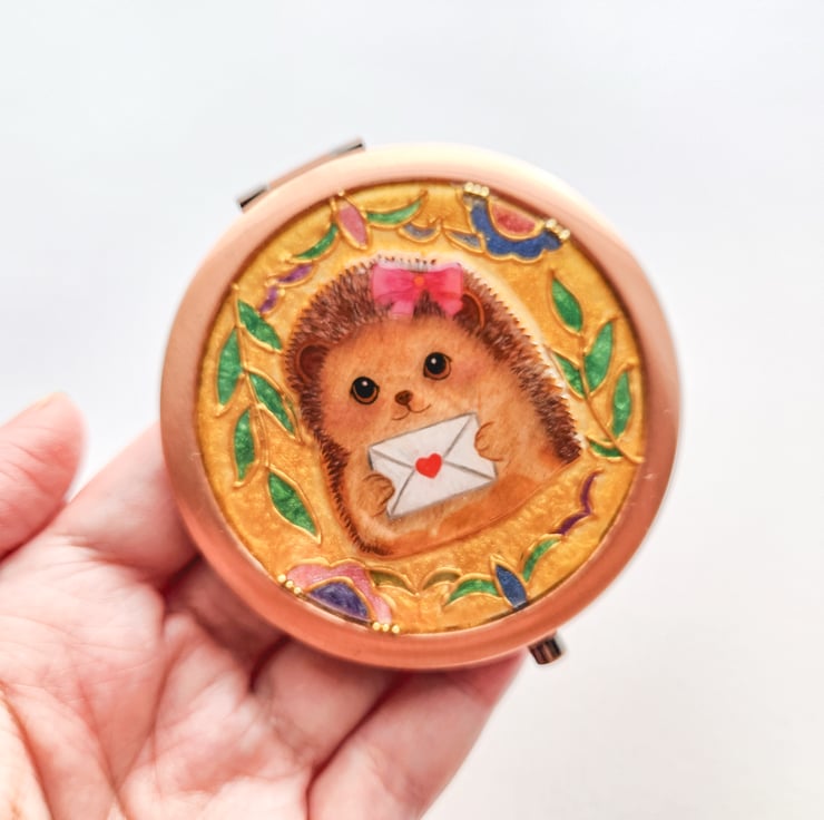 A handmade pocket mirror featuring a hedgehog illustration, holding a tiny love letter.