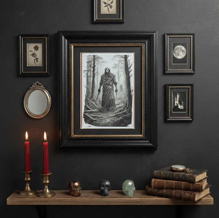 Add a touch of dark mystery to your space with this Gothic Reaper Forest Print. Featuring a haunting original design by Kate and Fate, this synthetic canvas print captures a somber, atmospheric scene perfect for lovers of macabre and occult art.
