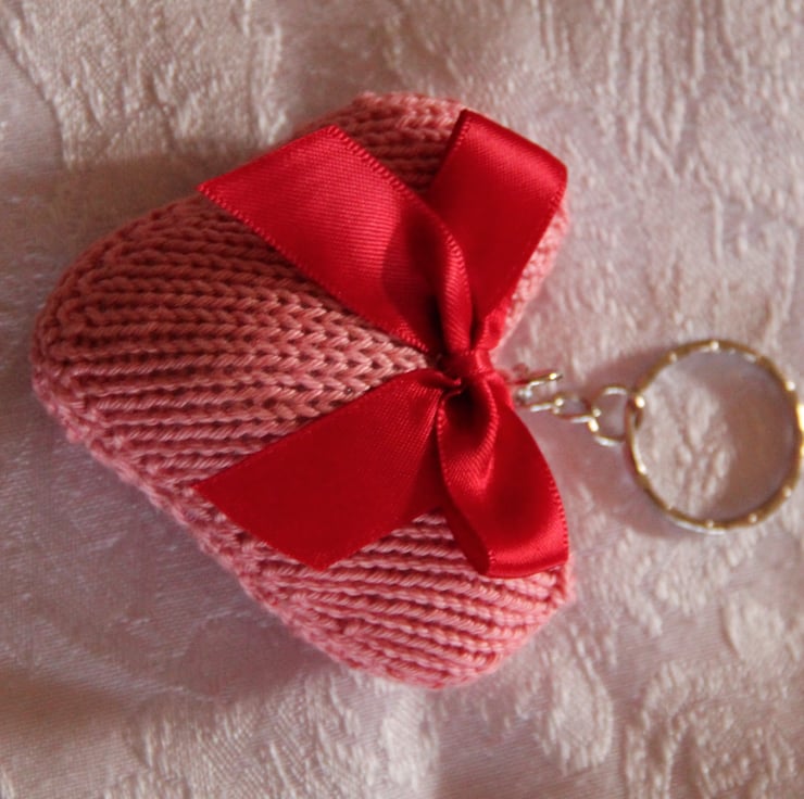 A pretty pink heart, hand knitted to my own design, in soft cotton yarn, with a red bow. The heart measures 7cm by 8cm (not incl. keyring attachment. Lovely as a keyring or bag charm, given as a Valentine's gift or just because.....!