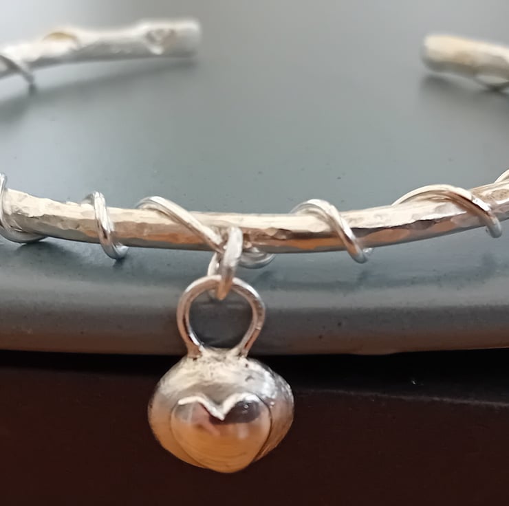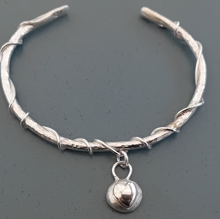A beautiful handmade sterling silver bracelet with a shiny silver heart on a textured silver pebble charm. Entwined onto the bracelet for safe and easy to wear jewellery, which exudes love.