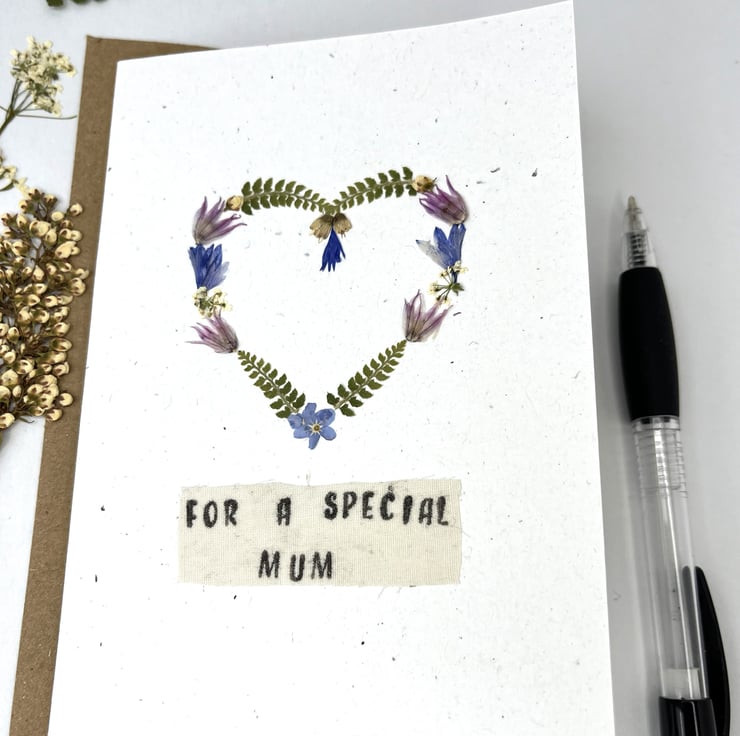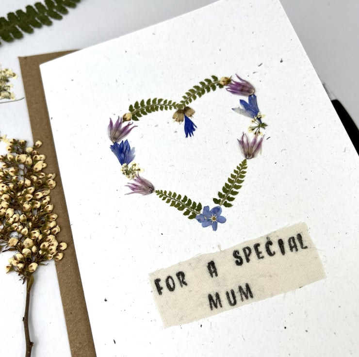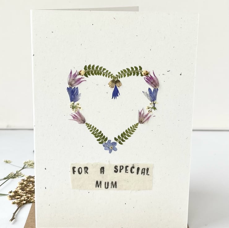 This lovingly handmade real pressed flower greeting card is made using flowers grown in our garden. With a hand printed message for mum.