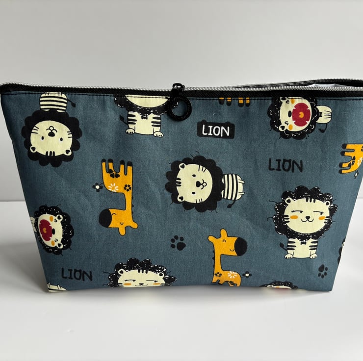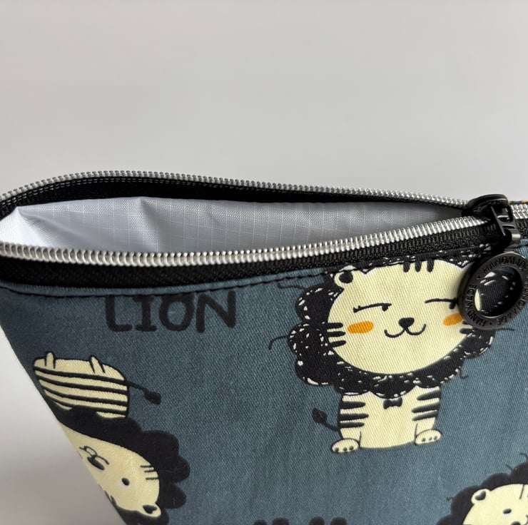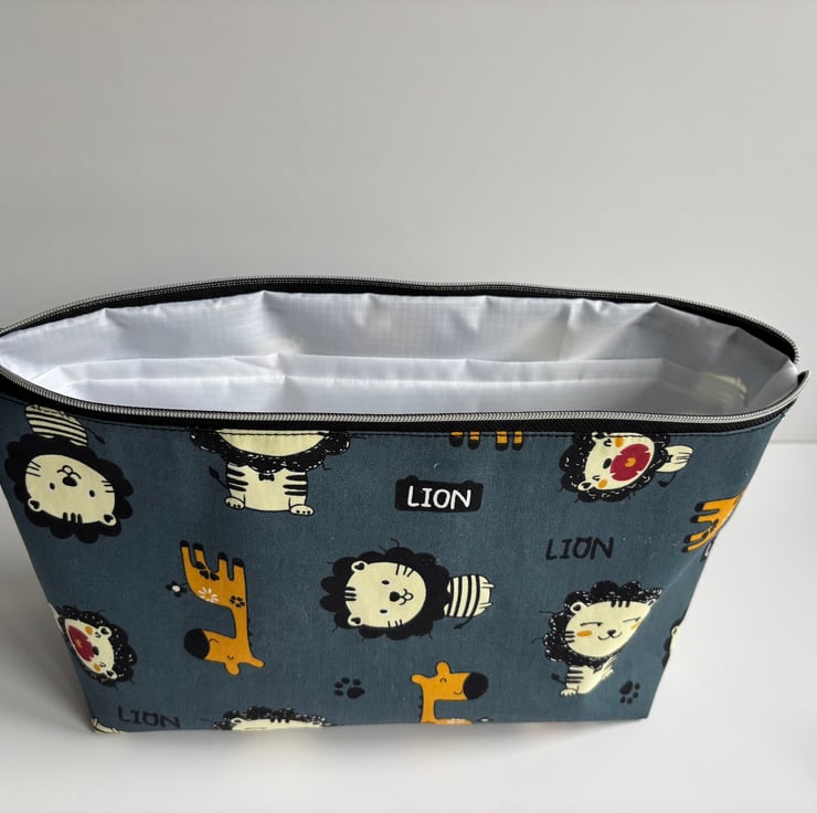 The trendy grey cotton exterior features adorable cartoon lions. The lining is a waterproof, white ripstop and the zip is black with silver coloured zip teeth and a stylish, black ring zip pull.