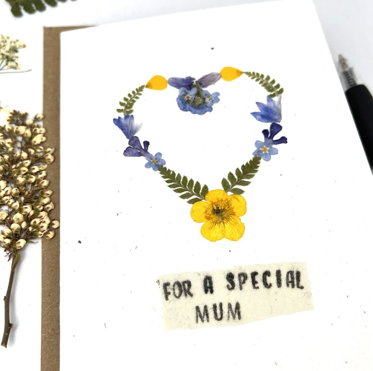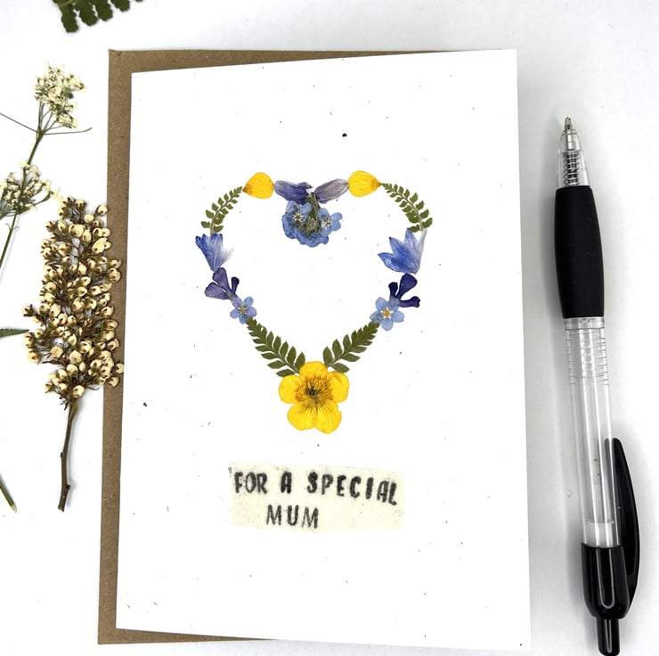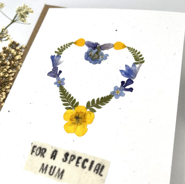 This lovingly handmade real pressed flower greeting card is made using flowers grown in our garden. With a hand printed message for mum.