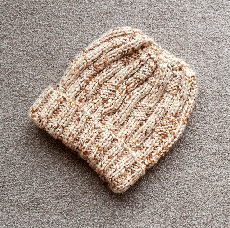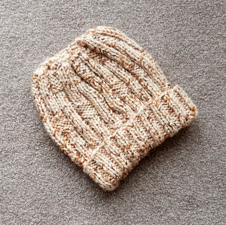 To fit: child (adult). Circumference: 39 (44) cm or 15.5 (17.5) inches. It is knitted in chunky yarn using 5.5 mm and 6 mm knitting needles. It is knit flat and seamed.