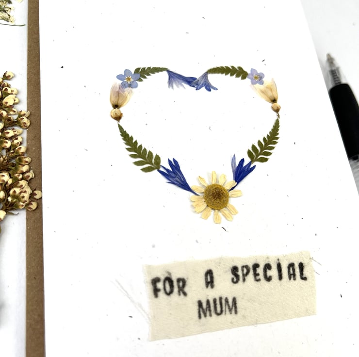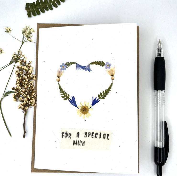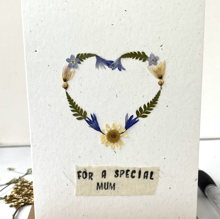 This lovingly handmade real pressed flower greeting card is made using flowers grown in our garden. With a hand printed message.