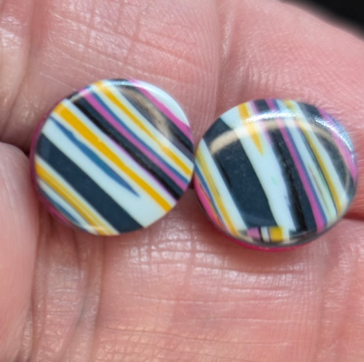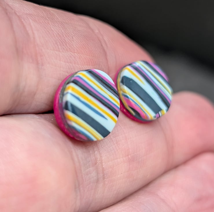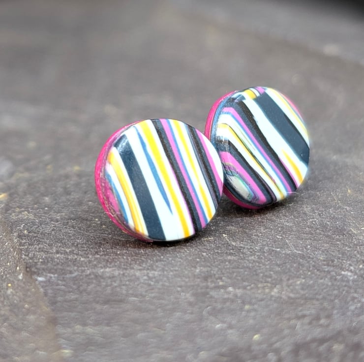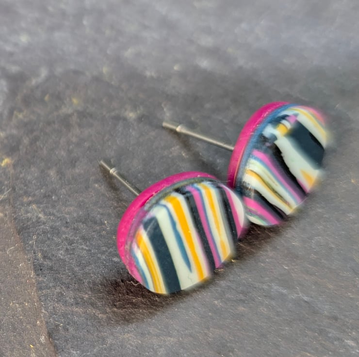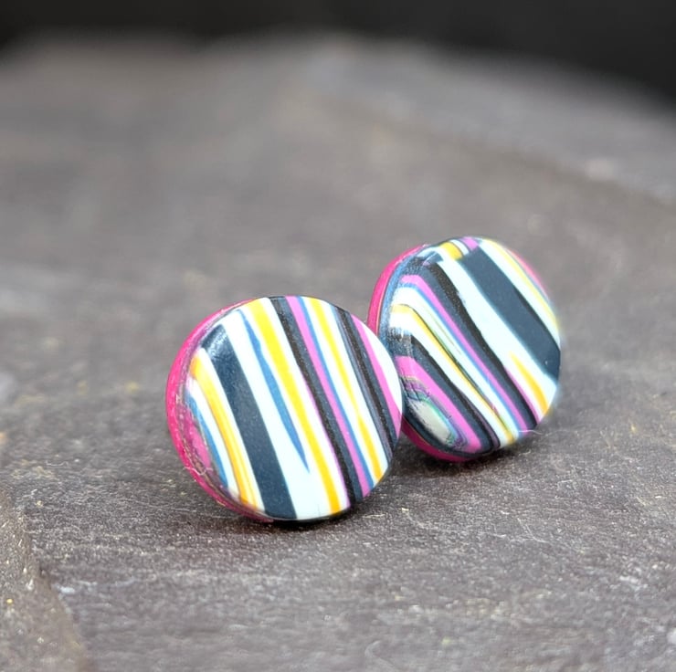These polymer clay studs are vibrant and multi-coloured, comprising of deep blue, magenta and ochre stripes. They are finished with a bold fucshia backing for a pop of hidden colour. These studs are a fantastic way to brighten up an outfit and could be a gift for yourself or a friend.