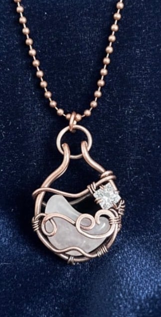 This Oxidised Copper Moon pendant is a handcrafted piece that would make a unique addition to any jewellery collection. The pendant features a moon shaped quartz and a beautiful cubic zirconia set in pure 99.9% Copper, patinated with Liver of Sulphur for a oxidised polished finish. This pendant is hung on a 18” copper ball chain.