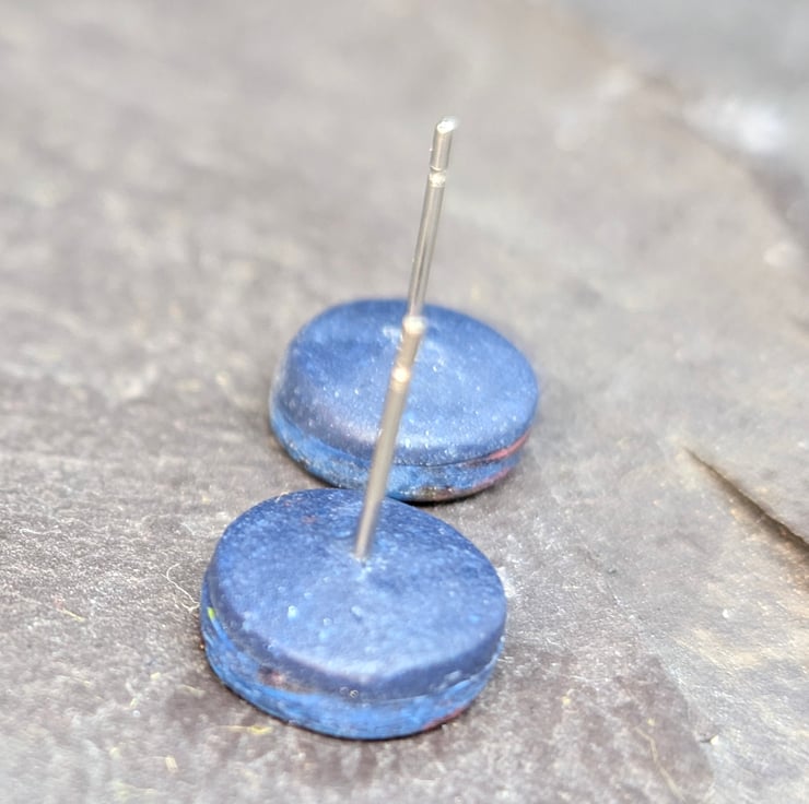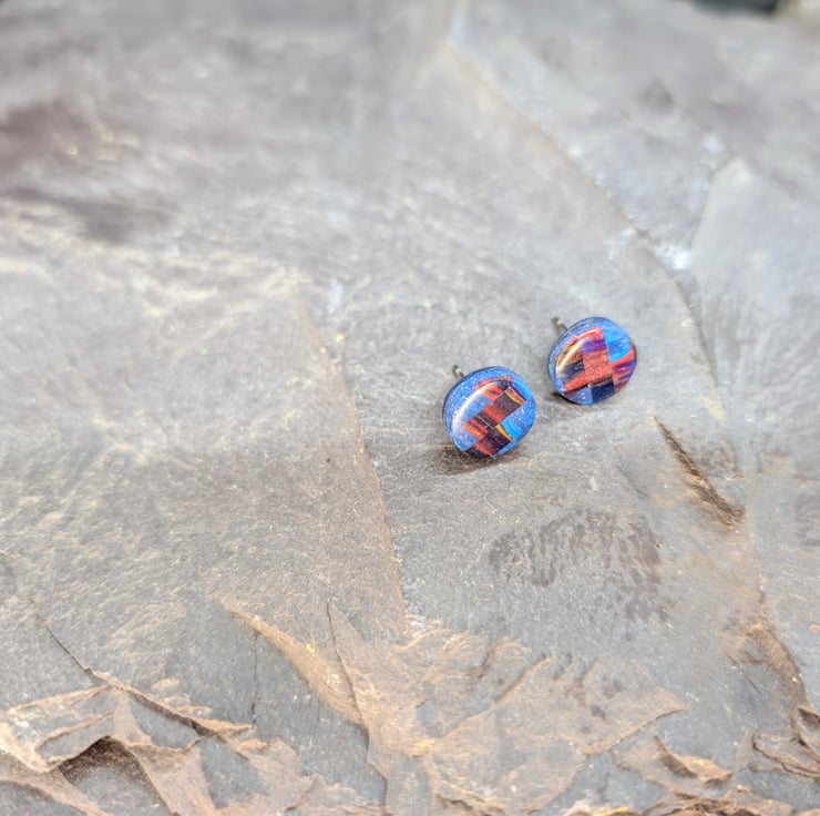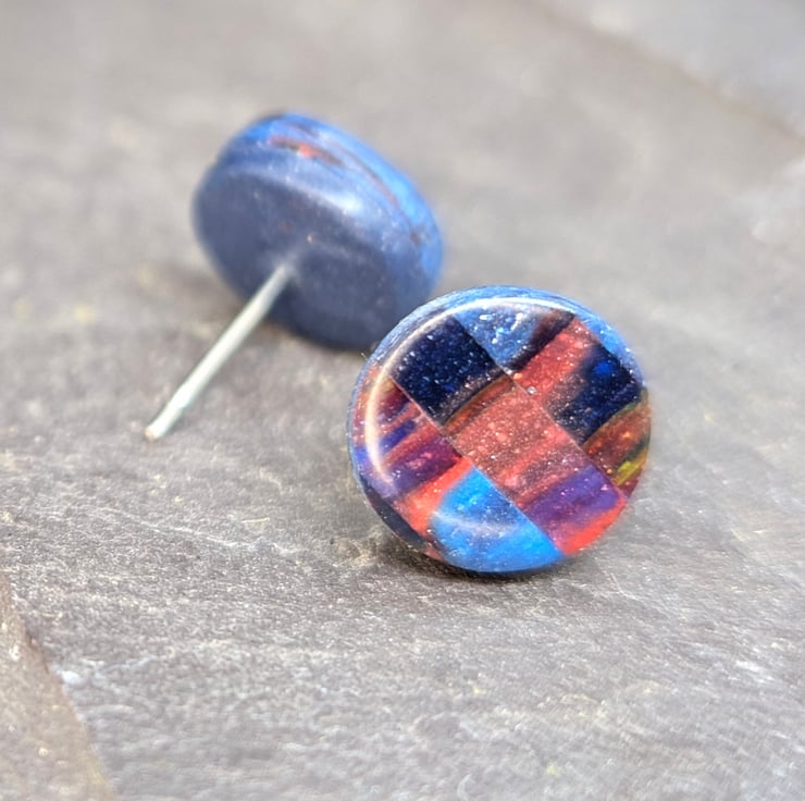 These cosmic feel stud earrings are made from only polymer clay and a stainless steel stud. They have been made using some translucent and opaque clay, carefully cut to give a stepped pattern. They also have a little sparkle within the clay, these studs add a little pop of colour to your outfit.
