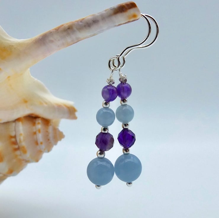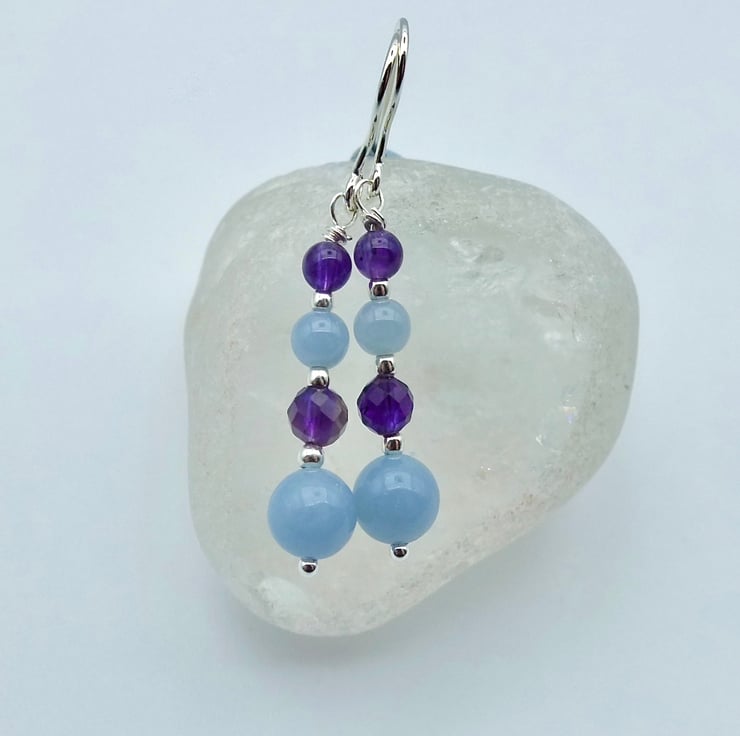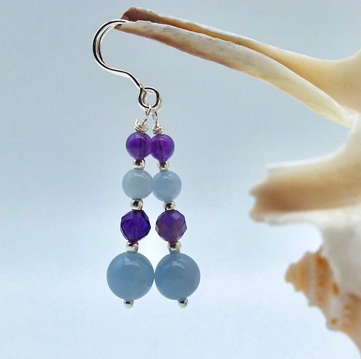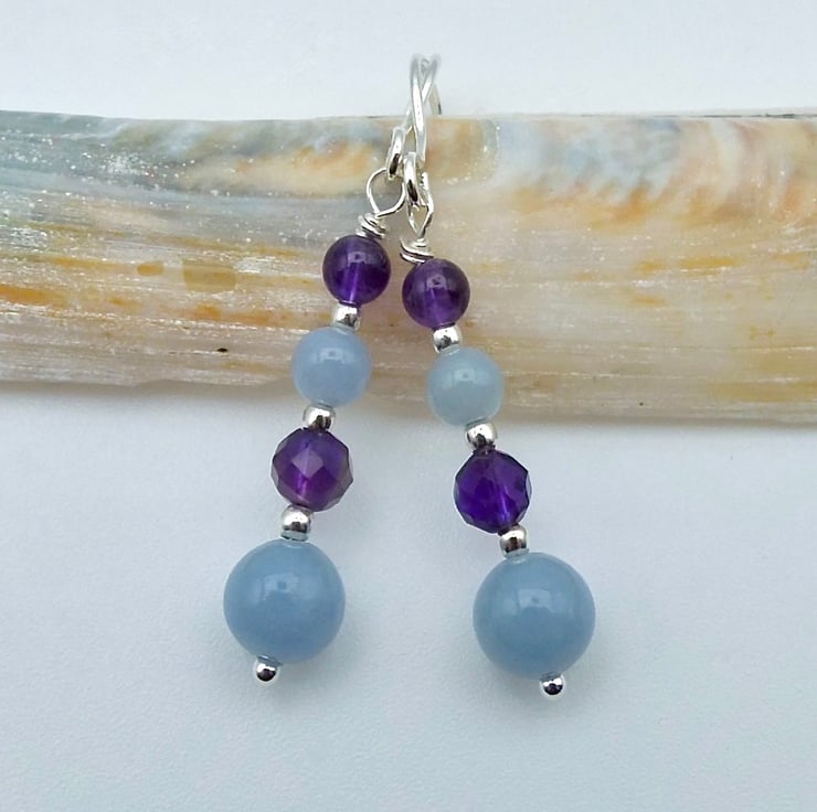 Each earring features a 6mm Angelite bead topped with a 4.5mm faceted Amethyst, 4mm Angelite and 3.5mm Amethyst bead, all separated by tiny 1.8mm sterling silver spacers.