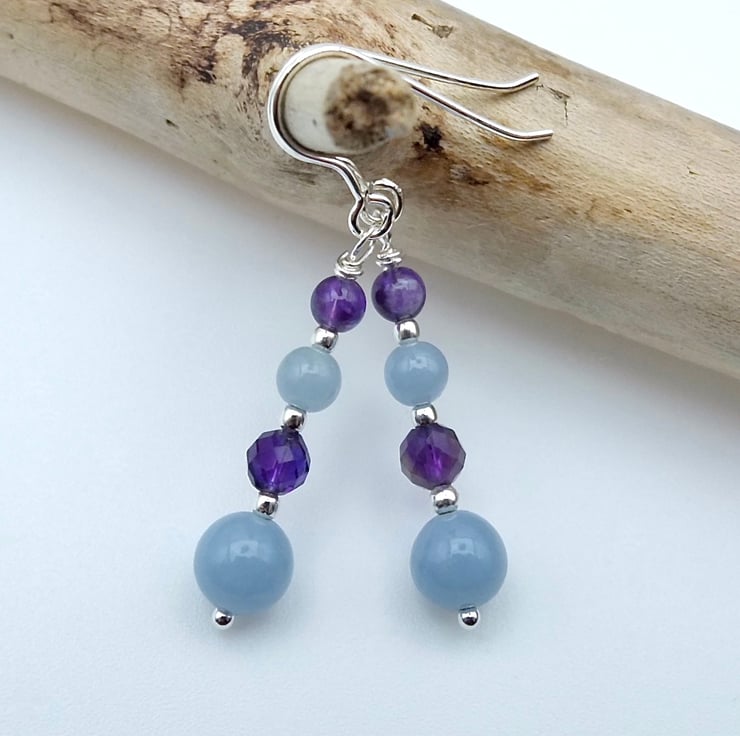 Dainty Amethyst, Angelite and sterling silver drop earrings.