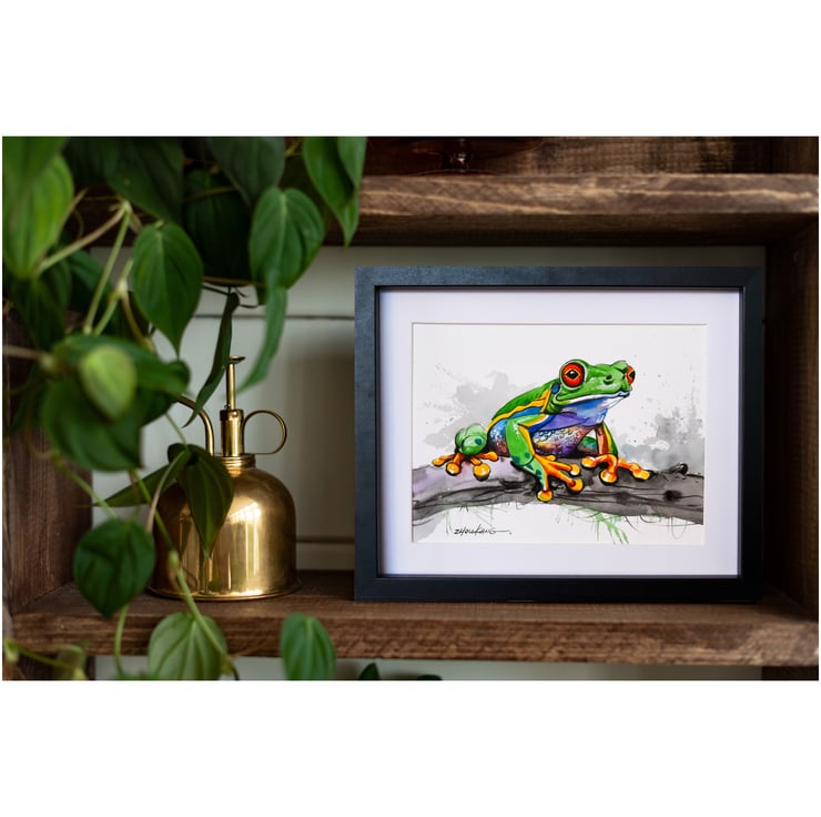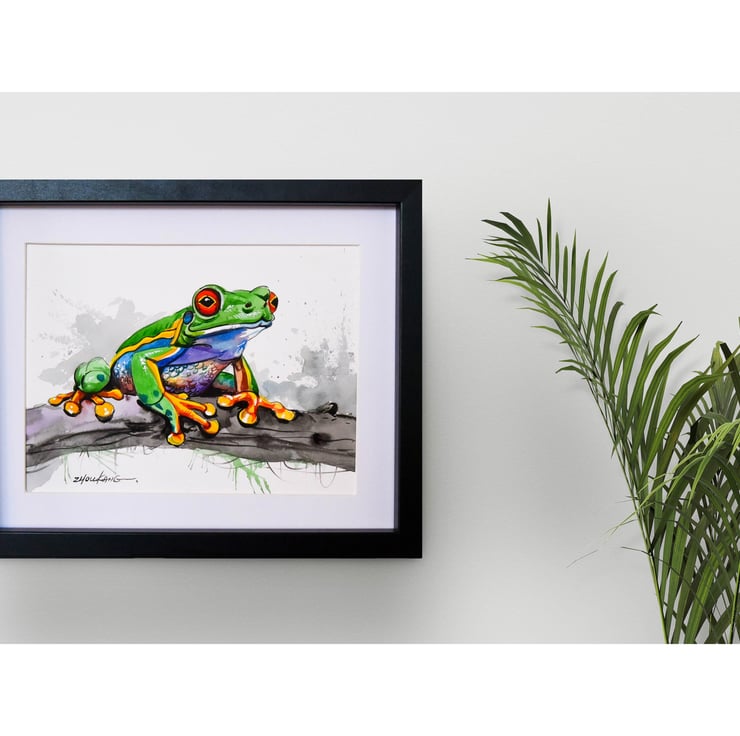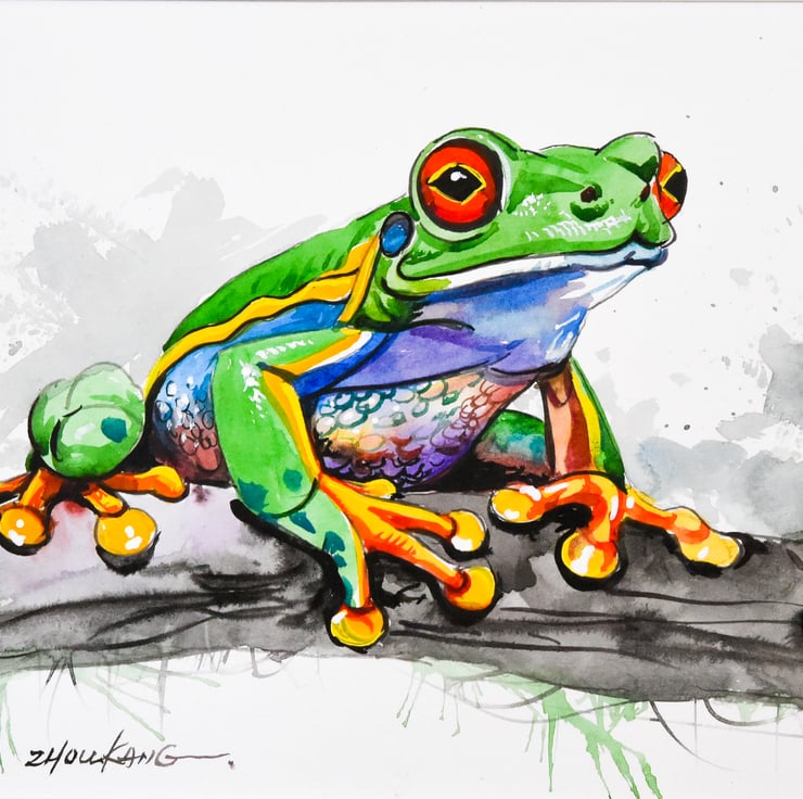 A jewel-bright frog pauses on a dark branch, its emerald body alive with ribbons of blue, gold, and flame. Wide, amber eyes gleam with quiet curiosity, while fluid brushstrokes and splashes of ink give the scene a sense of balance—poised between stillness and the promise of a sudden leap.