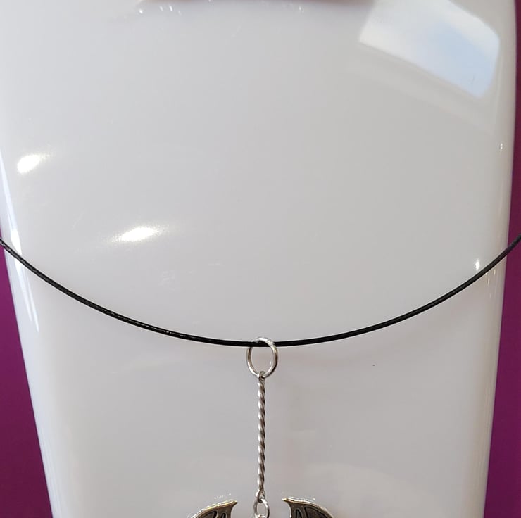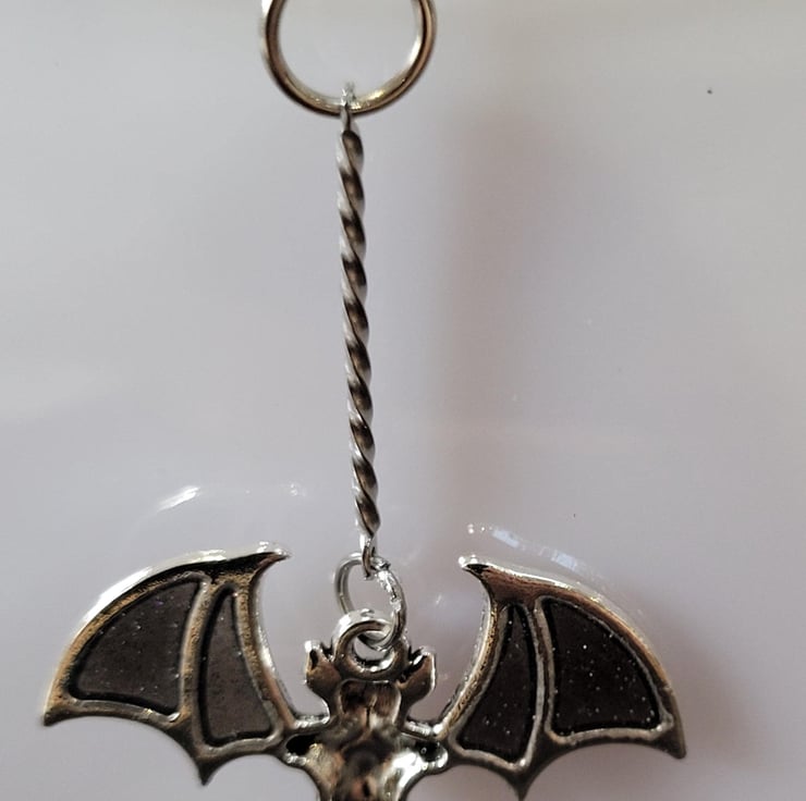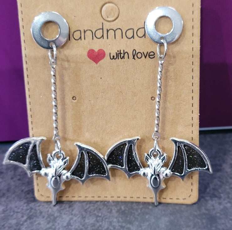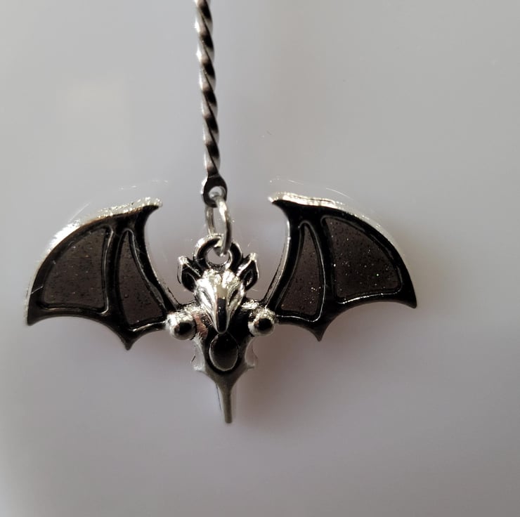 A bat earring and necklace set made out of black glitter resin. The earrings are made with hypoallergenic jewellery findings and stainless steel earring posts while the pendant hangs from a 16in black coated wire choker. All of the bats hang from a stainless steel 2.5cm lengthener to give them the appearance of flying. A perfect gift for the Goth in your life!