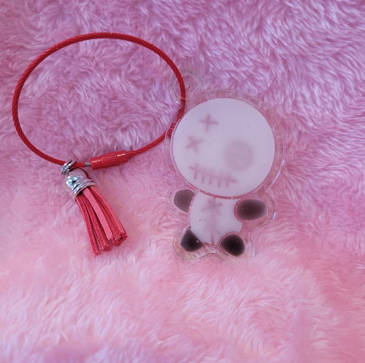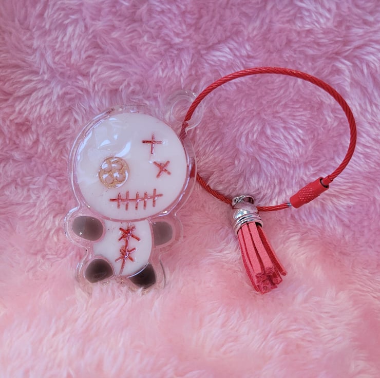 A cute little Voodoo Keychain or Accessory to hang from your backpack or purse. He's made out of resin and micr powder and he's hung from a red coated wire for strength and to make it easy to add as an accessory. He is approx. 2 12" long and 1 12" wide.