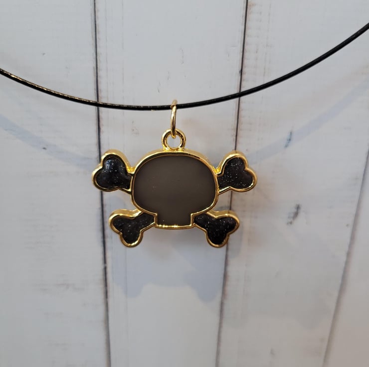 Jolly Roger Pirate Pendant made with Resin and highlighted with black holographic glitter. It's hung from a plastic coated 16" wire choker. Perfect for Fancy Dress, Halloween, or just a pirate at heart.