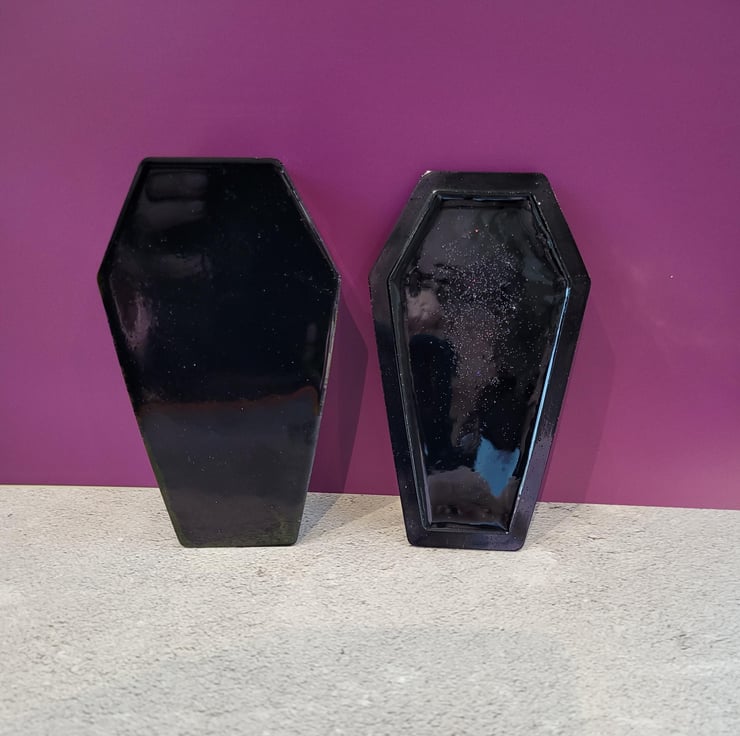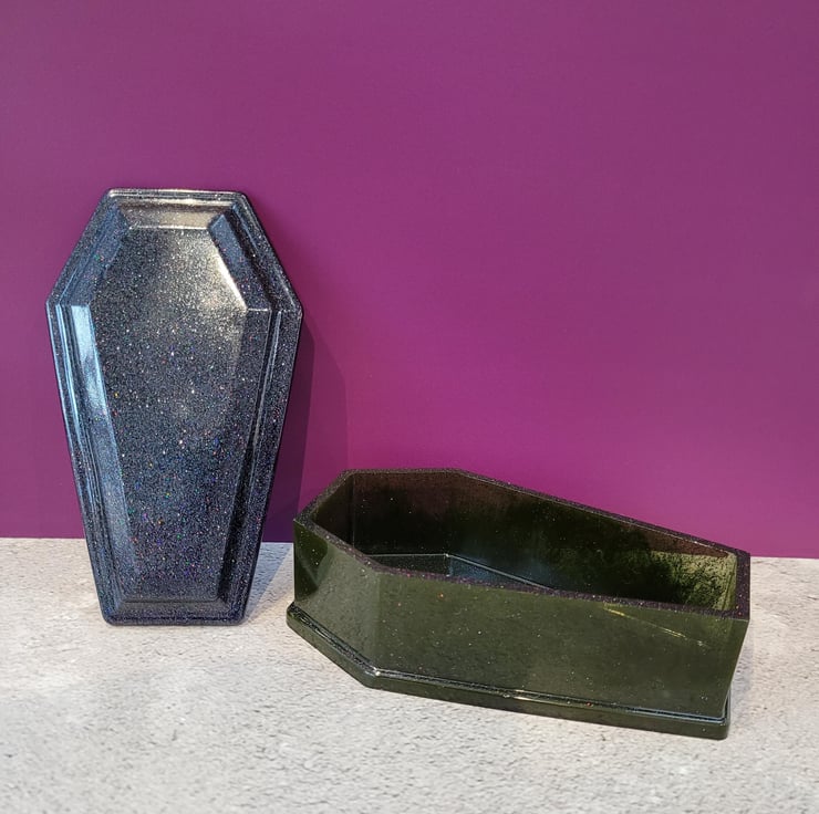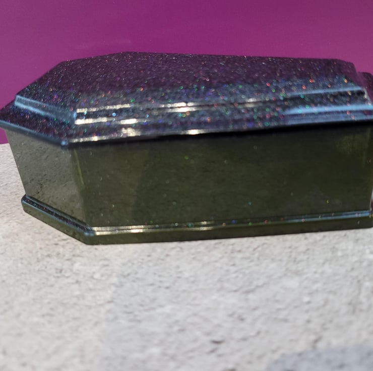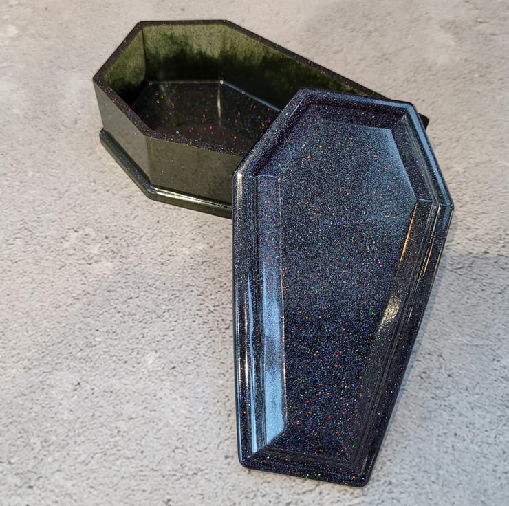 A black resin coffin shaped trinket dish with black holographic glitter. The lid of the coffin can be completely removed for different visual effects. It measures 4 12" long by 1 12" high. At the widest part it is 2 12" wide.