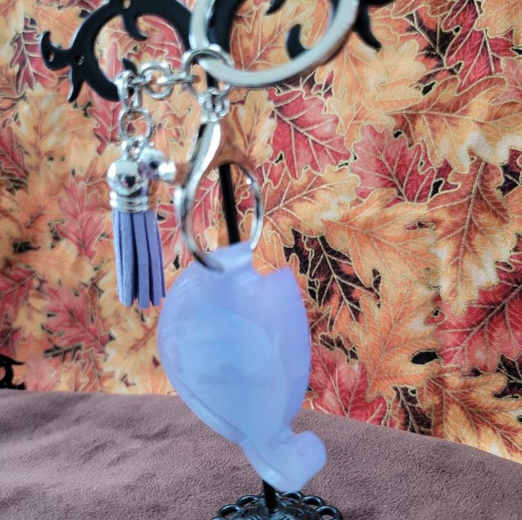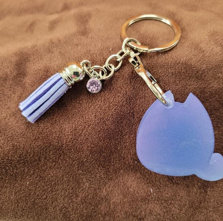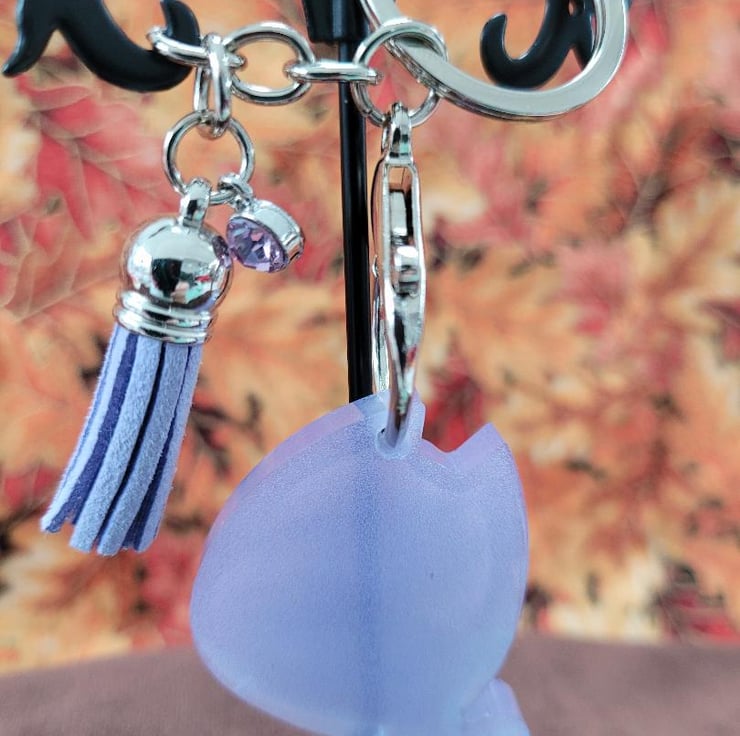 A Cat shaped Keychain made entirely of lavender coloured Resin. It is also adorned with a matching tassle. If you prefer a different colour, please send me a message and I will do my best to accommodate your request.