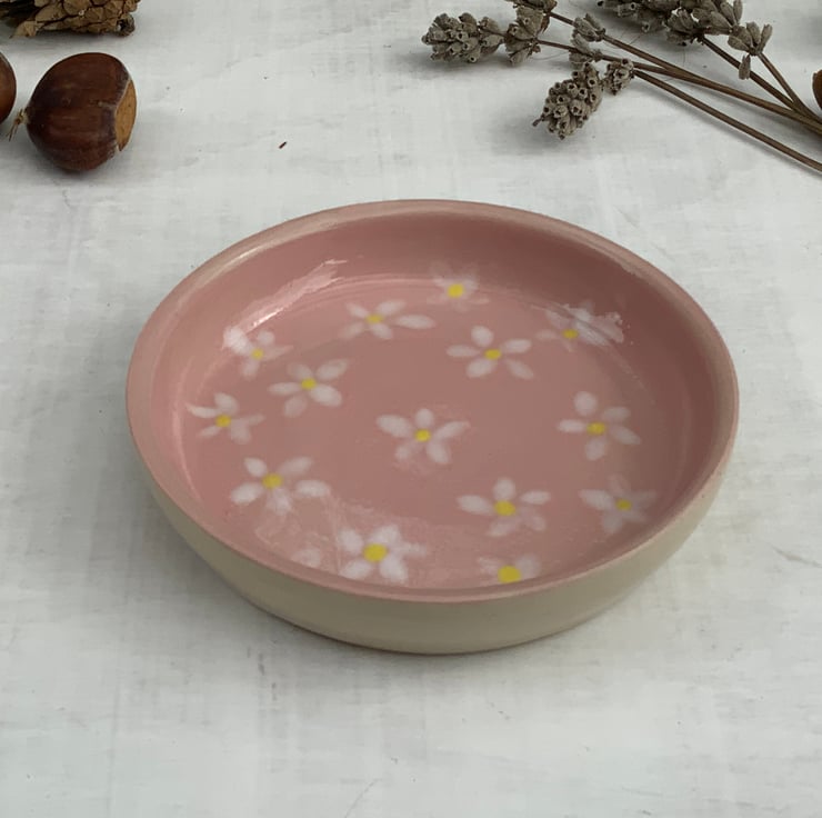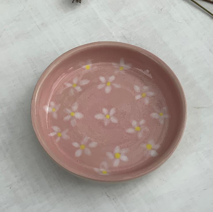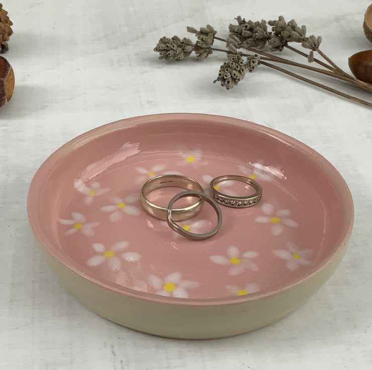 This beautiful little handmade wheel thrown dish is perfect for rings or your small trinkets. The dish has been hand glazed and inset with a small hand painted flower design. A practical and elegant item that can provide a temporary home for your rings and other small valuables.
