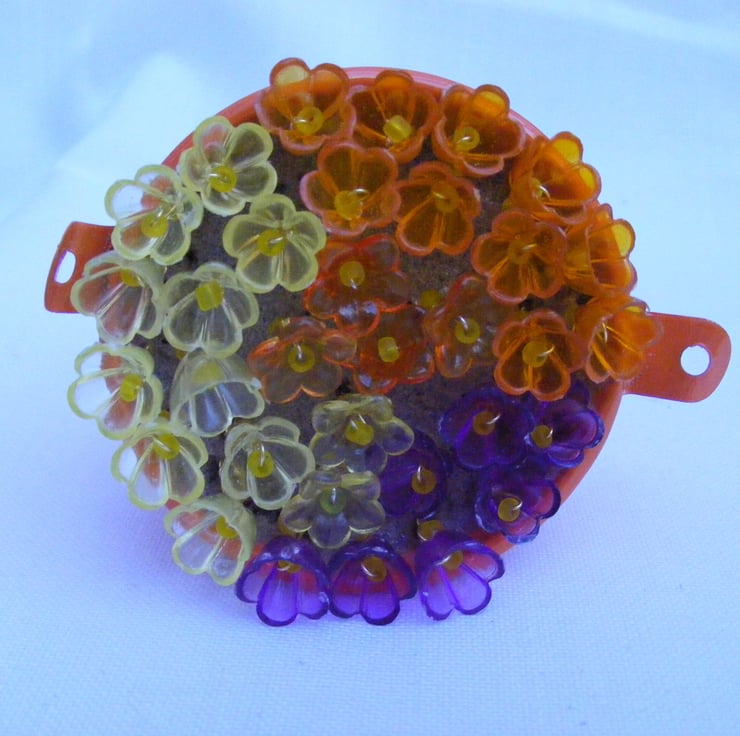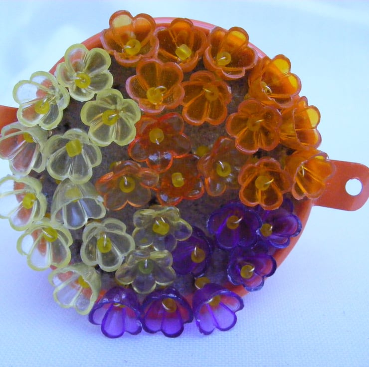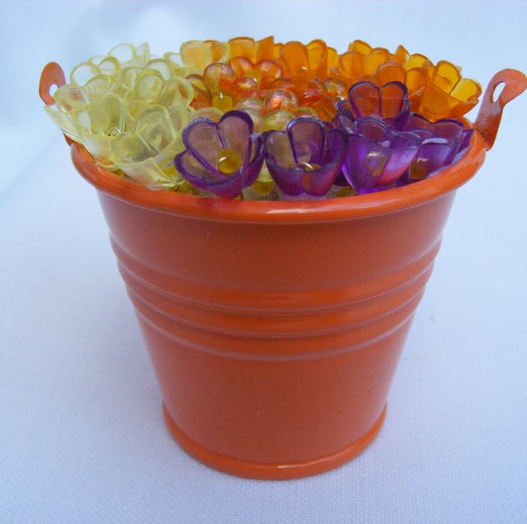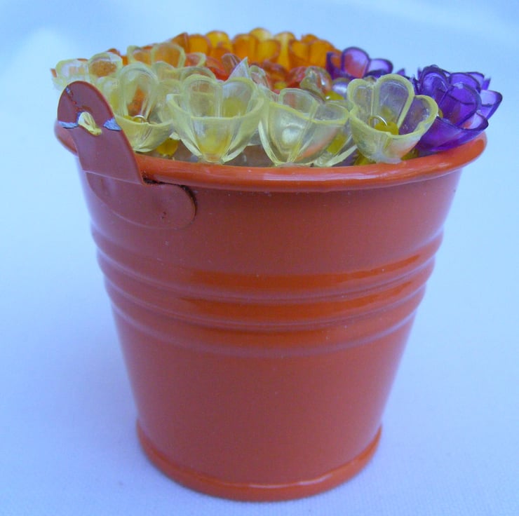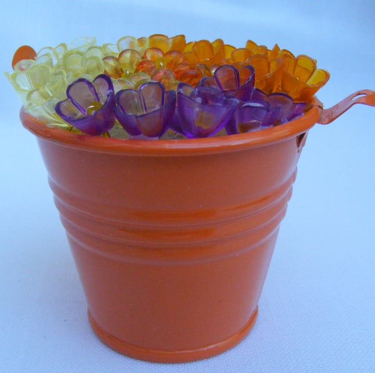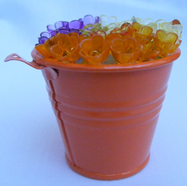 This colourful bucket of flowers would make a lovely easter gift, mother's day gift, birthday gift or a decoration for the home. I've handmade this decoration with, orange metal bucket, oasis, wire and lucite flowers. Flowers are glued to the oasis.